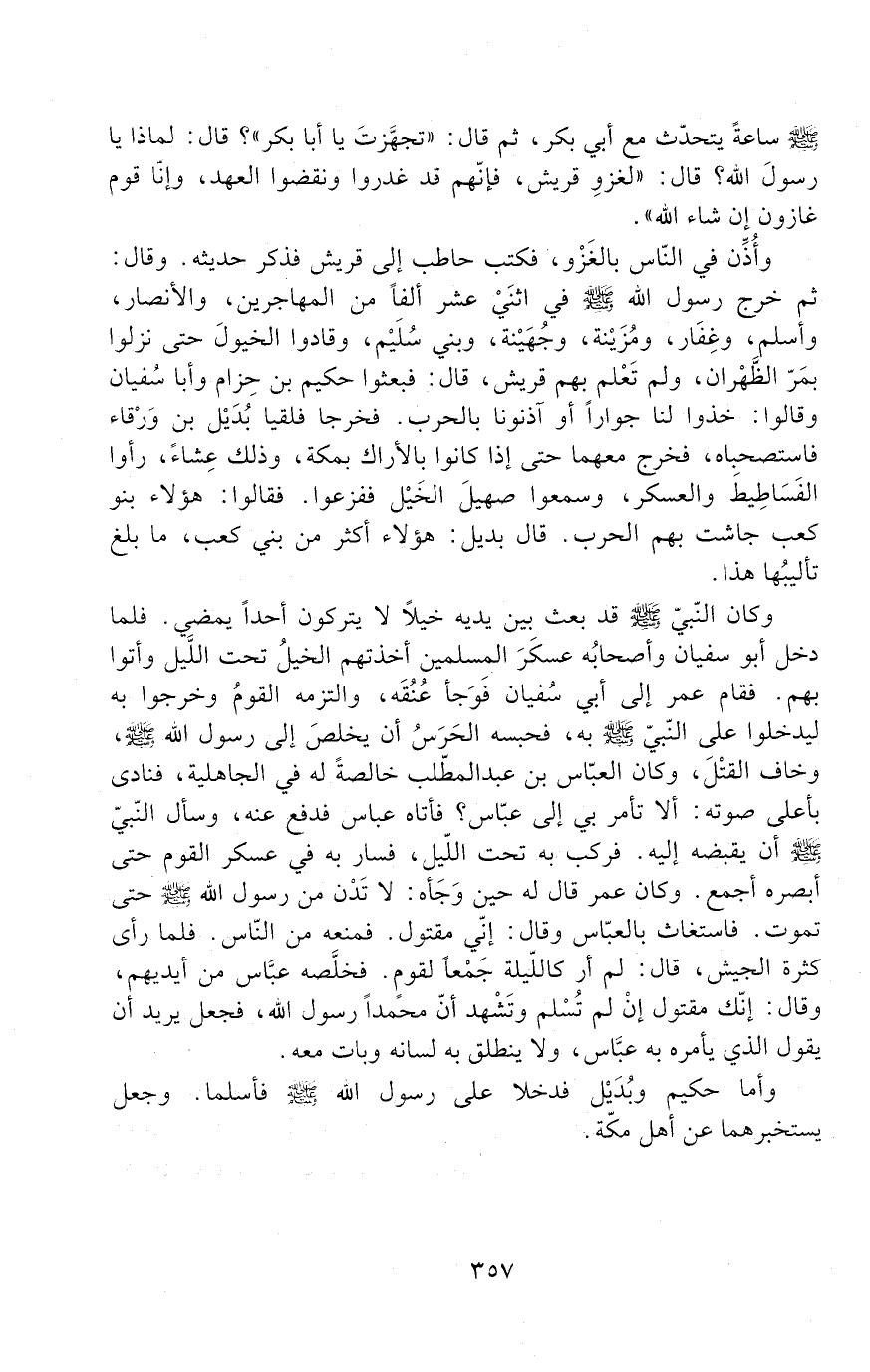 صَلَّى اللَّهُ عَلَيْهِ وَسَلَّمَ سَاعَةً يَتَحَدَّثُ مَعَ أَبِي بَكْرٍ ثُمَّ قَالَ: " تَجَهَّزْتَ يَا أَبَا بَكْرٍ "؟ قَالَ: لِمَاذَا يَا رَسُولَ اللَّهِ؟ قَالَ: " لِغَزْوِ قُرَيْشٍ؛ فَإِنَّهُمْ قَدْ غَدَرُوا وَنَقَضُوا الْعَهْدَ، وإنا قوم غَازُونَ إِنْ شَاءَ اللَّهُ ".