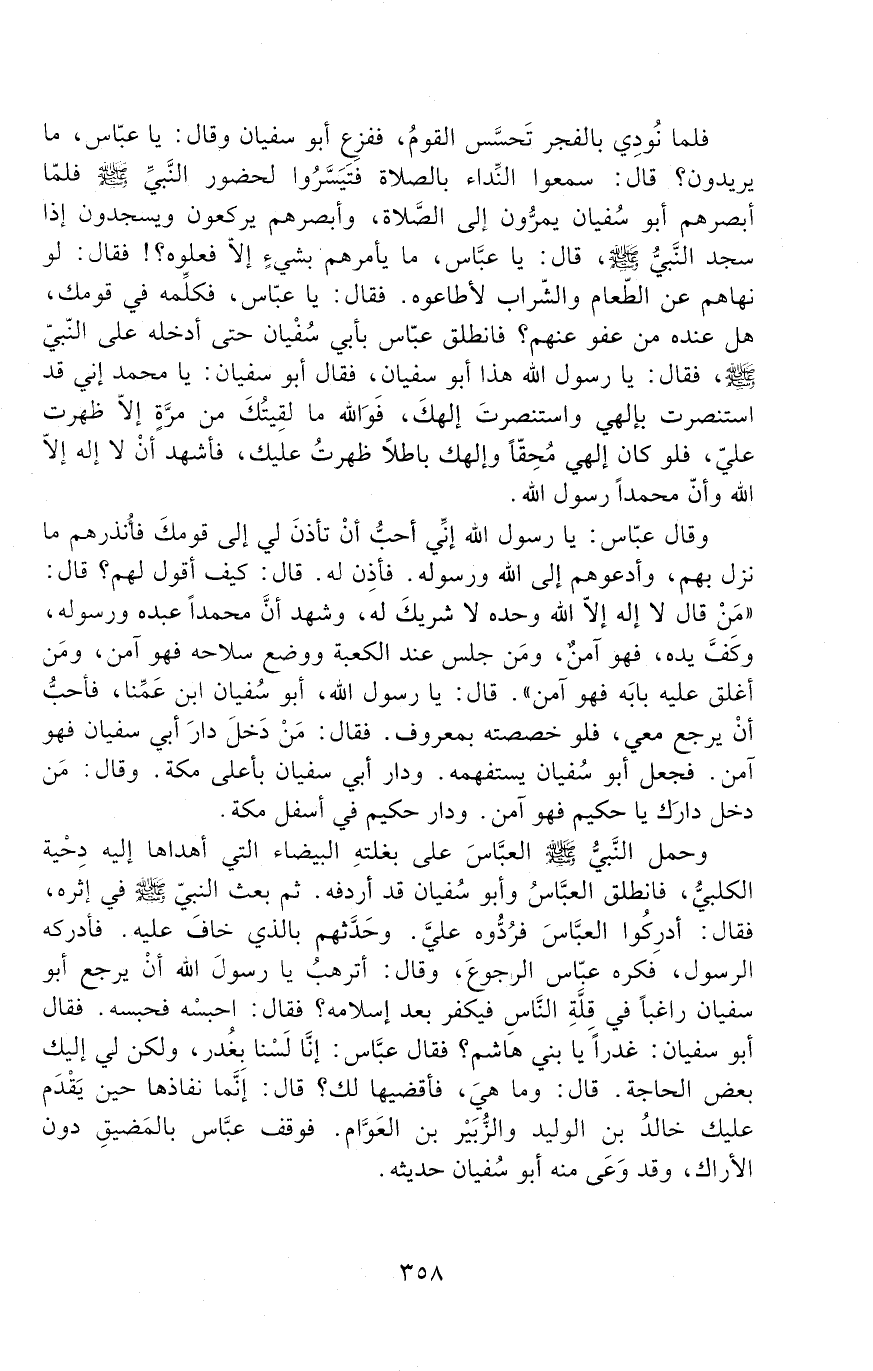 فَقَالَ أَبُو سُفْيَانَ: غَدْرًا يَا بَنِي هَاشِمٍ؟ فَقَالَ عَبَّاسٌ: إِنَّا لسنا بغدر، ولكن لي إِلَيْكَ بَعْضُ الْحَاجَةِ. فَقَالَ: وَمَا هِيَ، فَأَقْضِيهَا لَكَ؟ قَالَ: إِنَّمَا نَفَاذُهَا حِينَ يَقْدَمُ عَلَيْكَ خَالِدُ بْنُ الْوَلِيدِ وَالزُّبَيْرُ بْنُ الْعَوَّامِ. فَوَقَفَ عَبَّاسٌ بِالْمَضِيقِ دُونَ الأَرَاكِ، وَقَدْ وَعَى مِنْهُ أَبُو سُفْيَانَ حَدِيثَهُ.