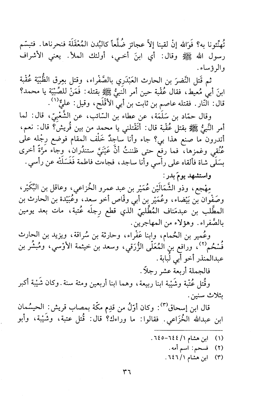 ثُمَّ قُتِلَ النَّضْرُ بْنُ الْحَارِثِ الْعَبْدَرِيُّ بِالصَّفْرَاءِ. وَقُتِلَ بِعِرْقِ الظُّبْيَةِ عُقْبَةُ بْنُ أَبِي مُعَيْطٍ. فَقَالَ عُقْبَةُ حِينَ أَمَر النَّبِيُّ - صَلَّى اللَّهُ عَلَيْهِ وَسَلَّمَ - بقتله: فمن لِلصِّبْيَةِ يَا مُحَمَّدُ؟ قَالَ: النَّارُ. فَقَتَلَهُ عَاصِمُ بْنُ ثَابِتِ بْنِ أَبِي الْأَقْلَحِ، وَقِيلَ: عَلِيٌّ.