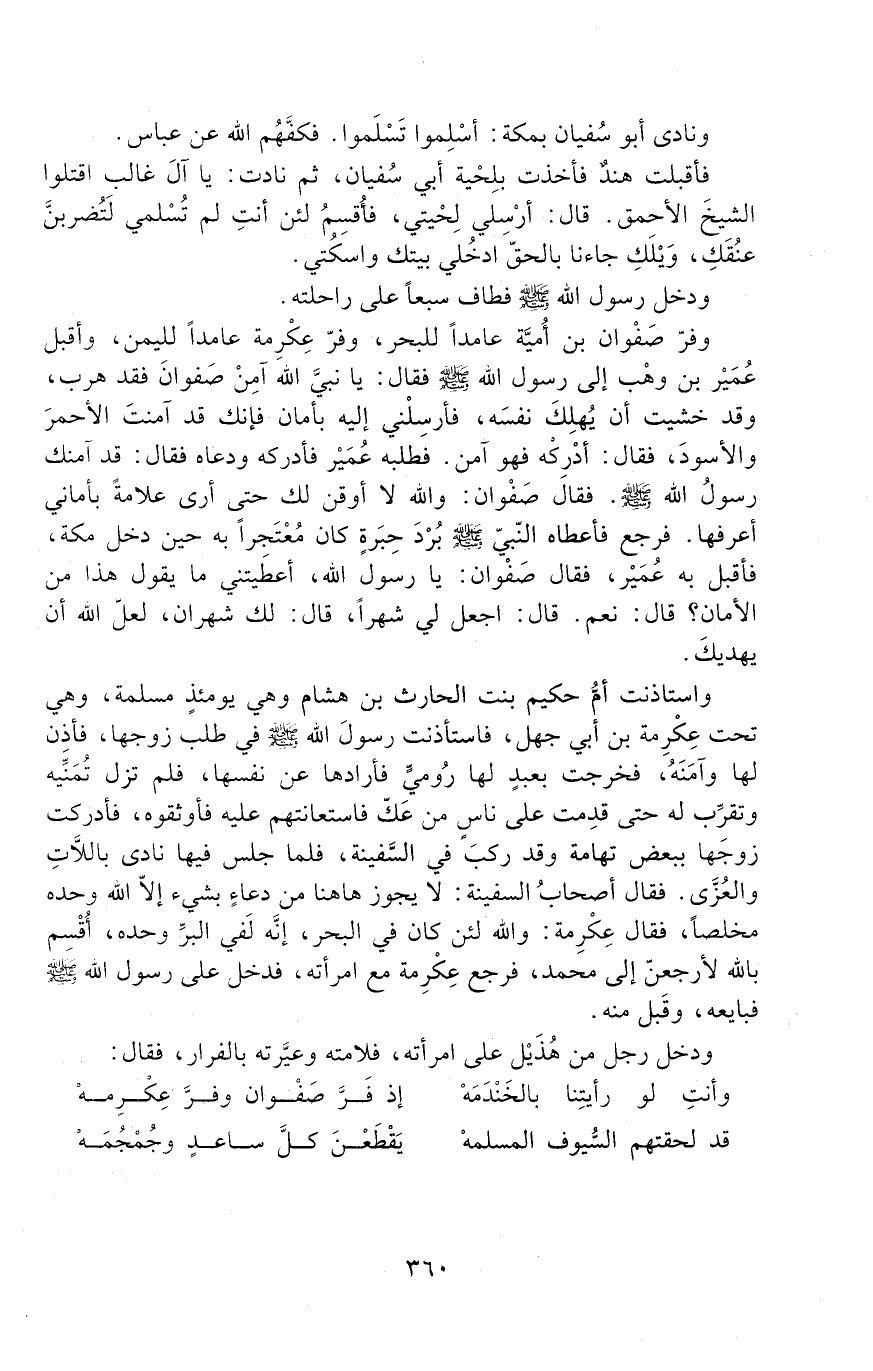 وَفَرَّ صَفْوَانُ بْنُ أُمَيَّةَ عَامِدًا لِلْبَحْرِ، وَفَرَّ عِكْرِمَةُ عَامِدًا لِلْيَمَنِ، وَأَقْبَلَ عُمَيْرُ بْنُ وَهْبٍ إِلَى رَسُولِ اللَّهِ صَلَّى اللَّهُ عَلَيْهِ وَسَلَّمَ فَقَالَ: يَا نَبِيَّ اللَّهِ، أَمِّنْ صَفْوَانَ؛ فَقَدْ هَرَبَ، وَقَدْ خَشِيتُ أن يهلك نفسه، فأرسلني إليه بأمان؛ فإنك قَدْ أمَّنْتَ الأَحْمَرَ وَالأَسْوَدَ! فَقَالَ: أَدْرِكْهُ فَهُوَ آمِنٌ.