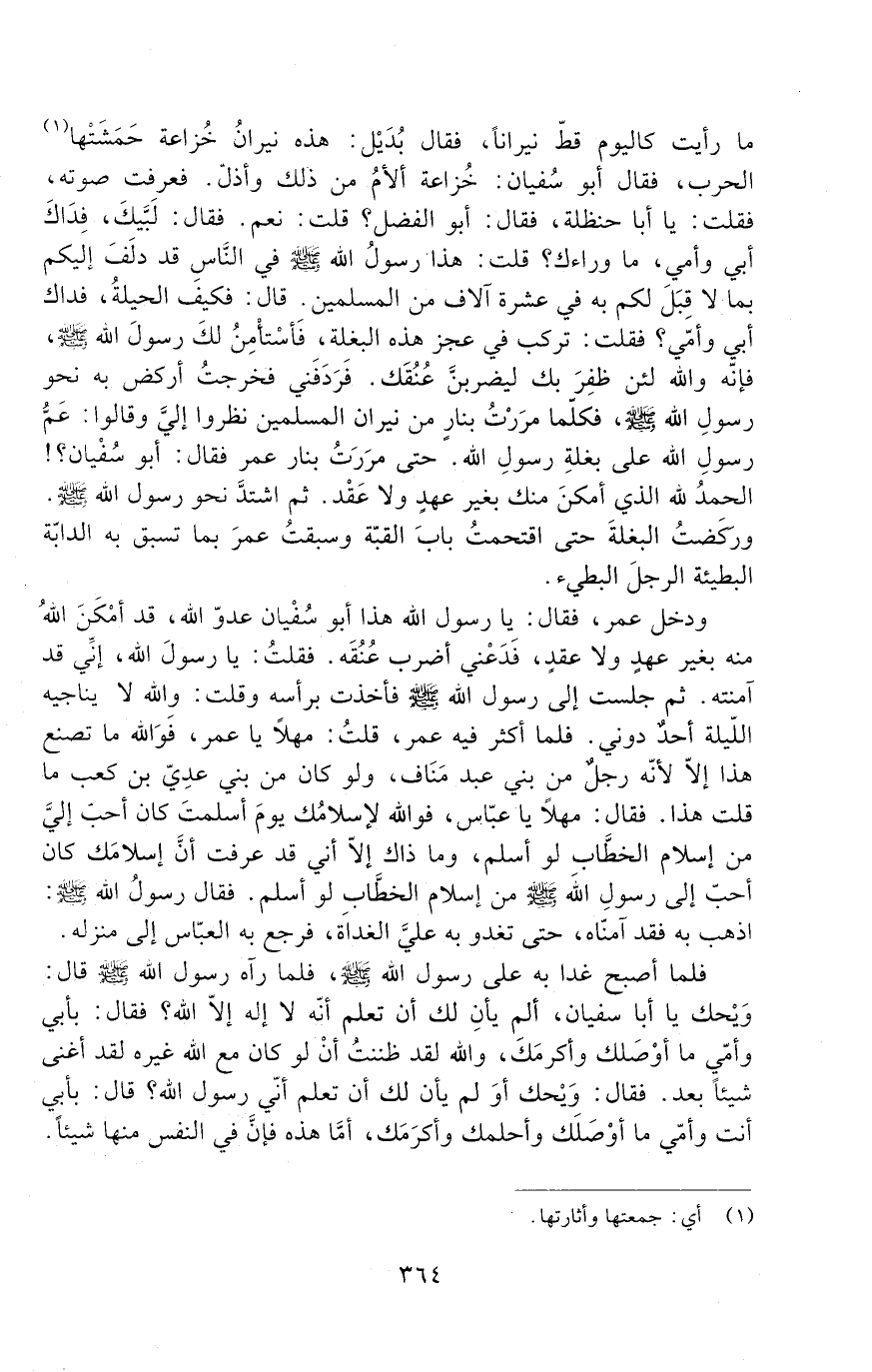 فَرَدَفَنِي، فَخَرَجْتُ أَرْكُضُ بِهِ نَحْوَ رَسُولِ اللَّهِ صَلَّى اللَّهُ عَلَيْهِ وَسَلَّمَ، فَكُلَّمَا مَرَرْتُ بِنَارٍ مِنْ نِيرَانِ الْمُسْلِمِينَ نَظَرُوا إِلَيَّ وَقَالُوا: عَمُّ رسول الله على بغلة رسول الله. حتى مررت بنار عمر فقال: أبو سُفْيَانَ؟! الْحَمْدُ لِلَّهِ الَّذِي أَمْكَنَ مِنْكَ بِغَيْرِ عَهْدٍ وَلا عَقْدٍ!