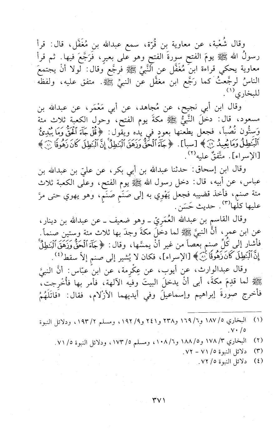 وَقَالَ ابْنُ أَبِي نَجِيحٍ عَنْ مُجَاهِدٍ، عَنْ أَبِي مَعْمَرٍ، عَنْ عَبْدِ اللَّهِ بْنِ مَسْعُودٍ، قَالَ: دَخَلَ النَّبِيُّ صَلَّى اللَّهُ عَلَيْهِ وَسَلَّمَ مَكَّةَ يَوْمَ الْفَتْحِ، وَحَوْلَ الْكَعْبَةِ ثَلَاثُمِائَةٍ وَسِتُّونَ نُصُبًا، فَجَعَلَ يطعنها بعود في يده ويقول: " قل جَاءَ الْحَقُّ وَمَا يُبْدِئُ الْبَاطِلُ وَمَا يُعِيدُ ". " جَاءَ الْحَقُّ وَزَهَقَ الْبَاطِلُ إِنَّ الْبَاطِلَ كَانَ زهوقا ". متفق عليه.