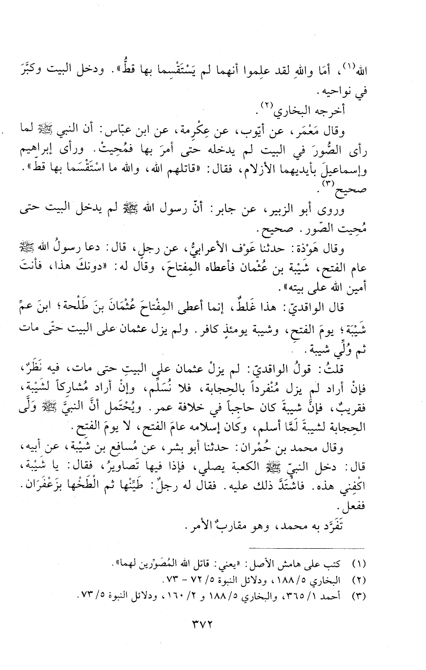 قُلْتُ: قَوْلُ الْوَاقِدِيِّ: لَمْ يَزَلْ عُثْمَانُ عَلَى الْبَيْتِ حَتَّى مَاتَ - فِيهِ نَظَرٌ؛ فَإِنْ أَرَادَ لَمْ يَزَلْ مُنْفَرِدًا بِالْحِجَابَةِ فَلا نُسَلِّمُ، وَإِنْ أَرَادَ مُشَارِكًا لِشَيْبَةَ فَقَرِيبٌ؛ فَإِنَّ شَيْبَةَ كَانَ حَاجِبًا فِي خِلافَةِ عُمَرَ. وَيُحْتَمَلُ أَنَّ النَّبِيَّ صلى الله عليه وسلم ولى الْحِجَابَةِ لِشَيْبَةَ لَمَّا أَسْلَمَ، وَكَانَ إِسْلامُهُ عَامَ الْفَتْحِ، لا يَوْمَ الْفَتْحِ.