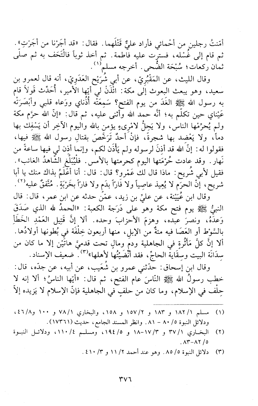 وَقَالَ اللَّيْثُ عَنِ الْمَقْبُرِيِّ، عَنْ أَبِي شُرَيْحٍ الْعَدَوِيِّ - أَنَّهُ قَالَ لِعَمْرِو بْنِ سَعِيدٍ، وَهُوَ يَبْعَث الْبُعُوثَ إِلَى مَكَّةَ: ائْذَنْ لِي أَيُّهَا الْأَمِيرُ، أُحَدِّثُ قَوْلًا قَامَ بِهِ رَسُولُ اللَّهِ صَلَّى اللَّهُ عَلَيْهِ وَسَلَّمَ الْغَدَ مِنْ يَوْمِ الْفَتْحِ، سَمِعَتْهُ أُذُنَايَ وَوَعَاهُ قَلْبِي وَأَبْصَرَتْهُ عَيْنَايَ حِينَ تَكَلَّمَ بِهِ! أَنَّهُ حَمِدَ اللَّهَ وَأَثْنَى عَلَيْهِ، ثُمَّ قَالَ: " إِنَّ اللَّهَ حَرَّمَ مَكَّةَ وَلَمْ يُحَرِّمْهَا النَّاسُ، وَلَا يَحِلُّ لامْرِئٍ يُؤْمِنُ بِاللَّهِ وَالْيَوْمِ الْآخِرِ أَنْ يَسْفِكَ بِهَا دَمًا، وَلَا يَعْضِدُ بِهَا شَجَرَةً، فَإِنْ أَحَدٌ تَرَخَّصَ بِقِتَالِ رَسُولِ اللَّهِ صَلَّى اللَّهُ عَلَيْهِ وَسَلَّمَ فِيهَا، فَقُولُوا لَهُ: إِنَّ اللَّهَ قَدْ أَذِنَ لِرَسُولِهِ وَلَمْ يَأْذَنْ لَكُمْ، وَإِنَّمَا أَذِنَ لِي فِيهَا سَاعَةً مِنْ نَهَارٍ، وَقَدْ عَادَتْ حُرْمَتُهَا الْيَوْمَ كَحُرْمَتِهَا بِالْأَمْسِ. فَلْيُبَلِّغْ الشَّاهِدُ الْغَائِبَ ".