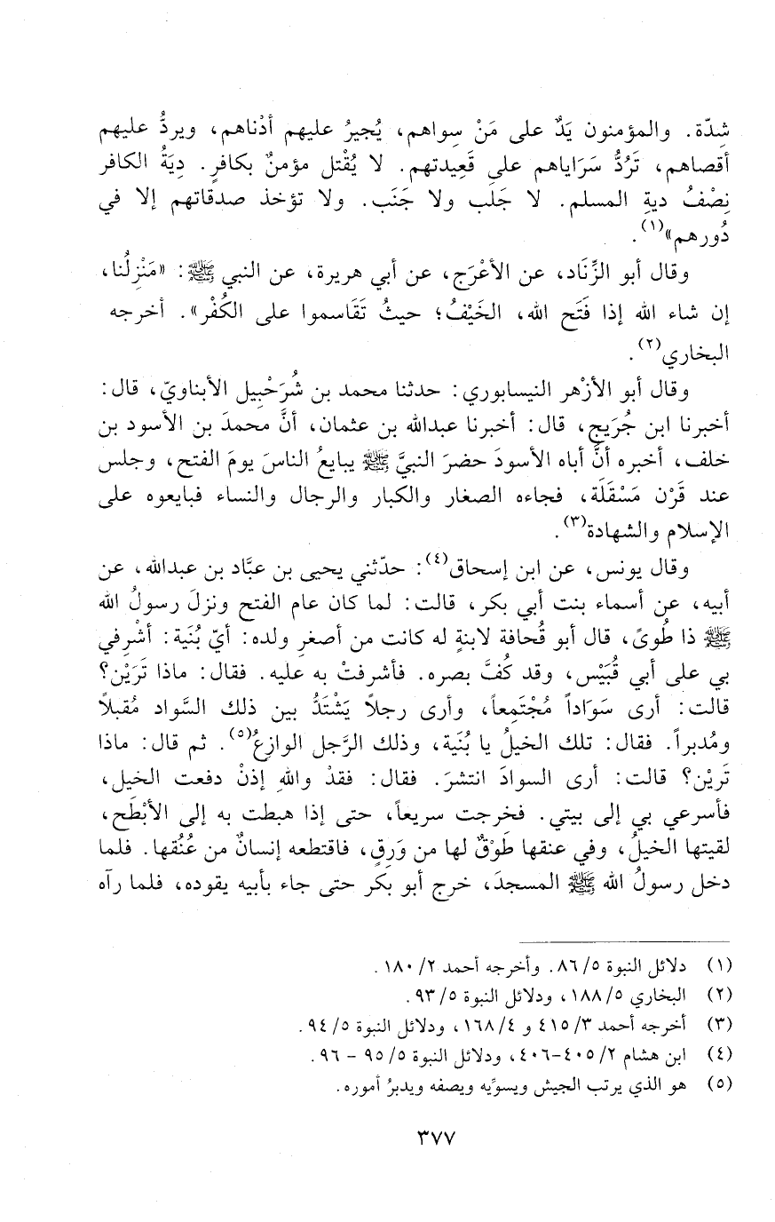 وَالْمُؤْمِنُونَ يَدٌ عَلَى مَنْ سِوَاهُمْ، يُجِيرُ عليهم أدناهم، ويرد عليهم أقصاهم. ترد سَرَايَاهُمْ عَلَى قَعِيدَتِهِمْ. لَا يُقْتَلُ مُؤْمِنٌ بِكَافرٍ. دِيَةُ الْكَافِرِ نِصْفُ دِيَةِ الْمُسْلِمِ. لَا جَلَبَ وَلَا جَنَبَ، وَلَا تُؤْخَذُ صَدَقَاتُهُمْ إِلَّا فِي دُورِهِمْ ".