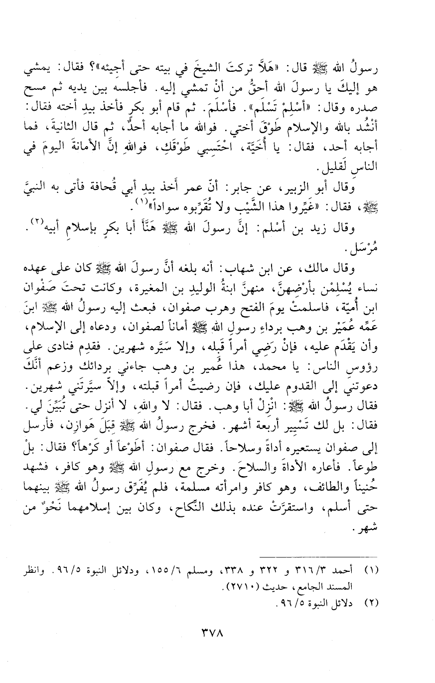 وقال مالك عَنِ ابن شهاب أَنَّهُ بلغه أَنَّ رَسُول اللَّهِ صَلَّى اللَّهُ عَلَيْهِ وَسَلَّمَ كَانَ عَلَى عهده نساء يُسْلِمْن بأَرْضِهنّ، منهنّ ابْنَة الوليد بْن المُغِيرة، وكانت تحت صَفْوان بْن أمية. فأسلمت يوم الفتح وهرب صفوان. فبعث إِلَيْهِ رَسُول اللَّهِ صَلَّى اللَّهُ عَلَيْهِ وَسَلَّمَ ابْنُ عمّه عُمَيْر بْن وهب برداء رَسُول اللَّهِ صَلَّى اللَّهُ عَلَيْهِ وَسَلَّمَ أمانًا لصفوان، ودعاه إلى الإسلام، وأن يَقْدَم عَلَيْهِ، فإنْ رَضِي أمرًا قَبِله، وإلا سَيَّره شهرين.