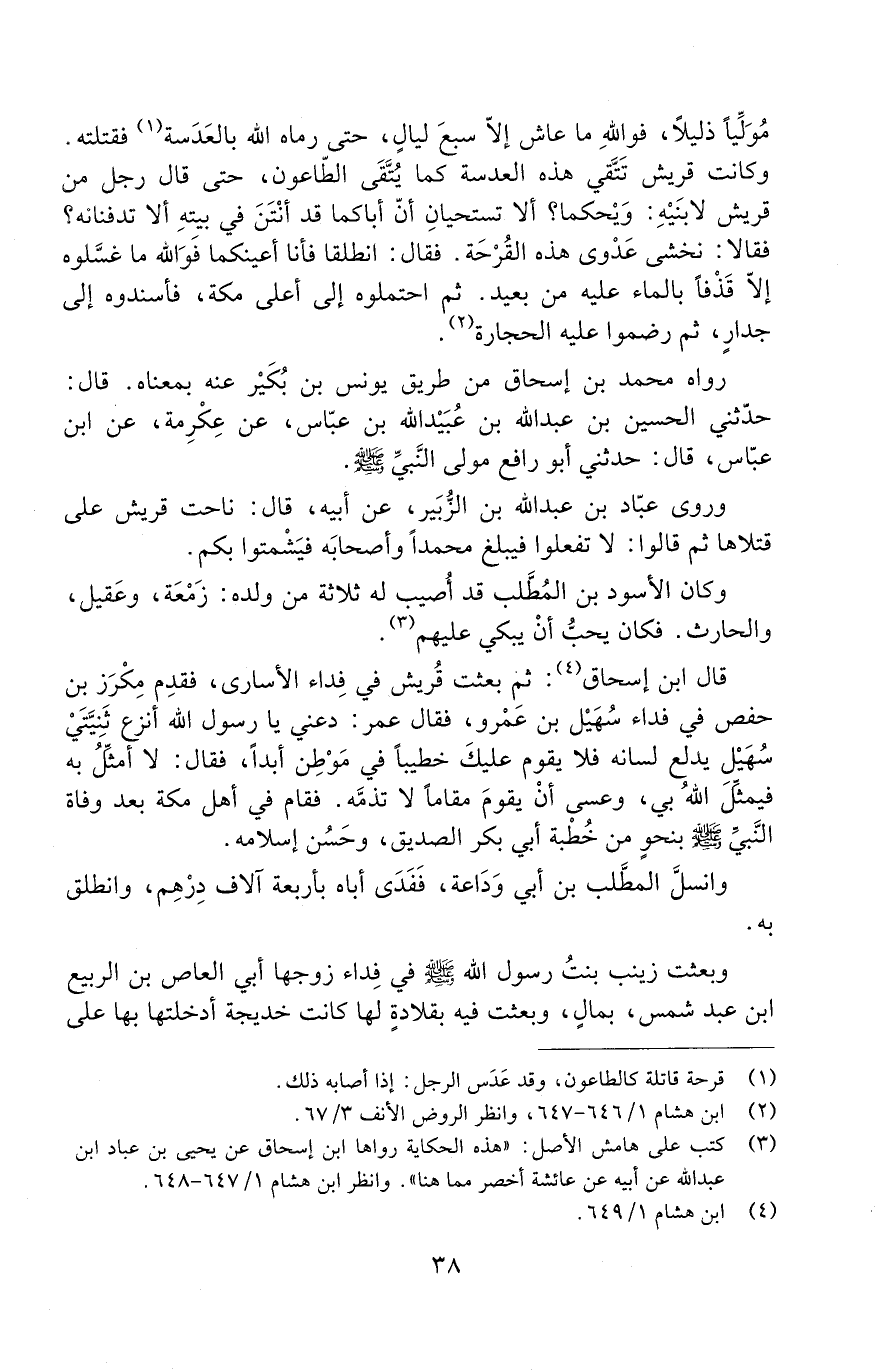 وَكَانَتْ قُرَيْشٌ تَتَّقِي هَذِهِ الْعَدَسَةَ كَمَا يُتَّقَى الطَّاعُونُ. حَتَّى قَالَ رَجُلٌ مِنْ قُرَيْشٍ لِابْنَيْهِ: وَيْحَكُمَا؟ ألا تَسْتَحِيَانِ أَنَّ أَبَاكُمَا قَدْ أَنْتَنَ فِي بَيْتِهِ ألا تَدْفِنَانَهُ؟ فَقَالَا: نَخْشَى عَدْوَى هَذِهِ الْقُرْحَةِ. فَقَالَ: انْطَلِقَا فَأَنَا أُعِينُكُمَا فَوَاللَّهِ مَا غَسَّلُوهُ إِلَّا قَذْفًا بِالْمَاءِ عَلَيْهِ مِنْ بَعِيدٍ. ثُمَّ احْتَمَلُوهُ إِلَى أَعْلَى مَكَّةَ، فَأَسْنَدُوهُ إِلَى جِدَارٍ، ثُمَّ رَضَمُوا عَلَيْهِ الْحِجَارَةَ.