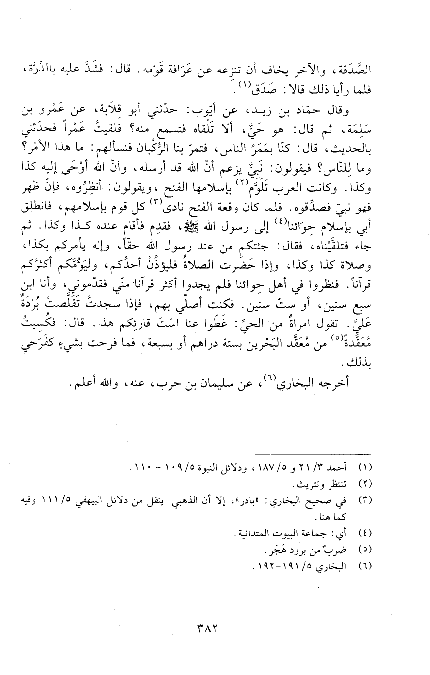 وَقَالَ حَمَّادُ بْنُ زَيْدٍ عَنْ أَيُّوبَ: حَدَّثَنِي أَبُو قِلابَةَ عَنْ عَمْرِو بْنِ سَلَمَةَ، ثُمَّ قَالَ: هُوَ حَيٌّ، أَلا تَلْقَاهُ فَتَسْمَعُ مِنْهُ؟ فَلَقِيتُ عَمْرًا فَحَدَّثَنِي بِالْحَدِيثِ، قَالَ: كُنَّا بِمَمَرِّ النَّاسِ، فَتَمُرُّ بِنَا الرُّكْبَانُ، فَنَسْأَلُهُمْ: مَا هَذَا الأَمْرُ؟ وَمَا لِلنَّاسِ؟ فَيَقُولُونَ: نَبِيٌّ يَزْعُمُ أَنَّ اللَّهَ قَدْ أَرْسَلَهُ، وَأَنَّ اللَّهَ أَوْحَى إِلَيْهِ كَذَا وَكَذَا، وَكَانَتِ الْعَرَبُ تَلَوَّمُ بِإِسْلامِهَا الْفَتْحَ. وَيَقُولُونَ: أَنْظِرُوهُ، فَإِنْ ظَهَرَ فَهُوَ نَبِيٌّ فَصَدِّقُوهُ.