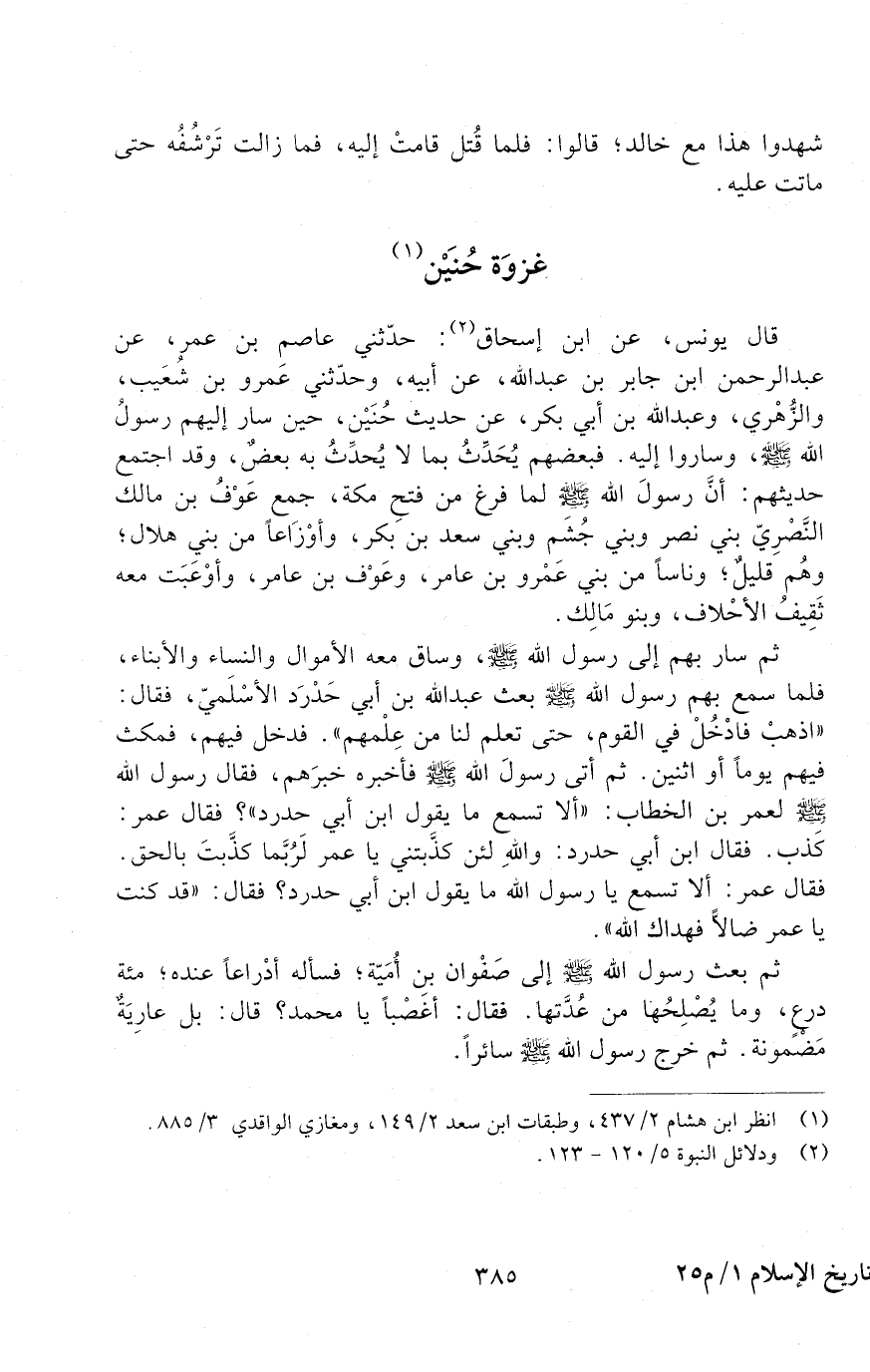 قَالَ يُونُسُ عَنِ ابن إسحاق: حدثني عاصم بن عمر عن عبد الرحمن ابن جَابِرِ بْنِ عَبْدِ اللَّهِ، عَنْ أَبِيهِ. وَحَدَّثَنِي عَمْرُو بْنُ شُعَيْبٍ وَالزُّهْرِيُّ وَعَبْدُ اللَّهِ بْنُ أَبِي بَكْرٍ عَنْ حَدِيثِ حُنَيْنٍ، حِينَ سَارَ إِلَيْهِمْ رَسُولُ اللَّهِ صَلَّى اللَّهُ عَلَيْهِ وَسَلَّمَ، وَسَارُوا إِلَيْهِ.