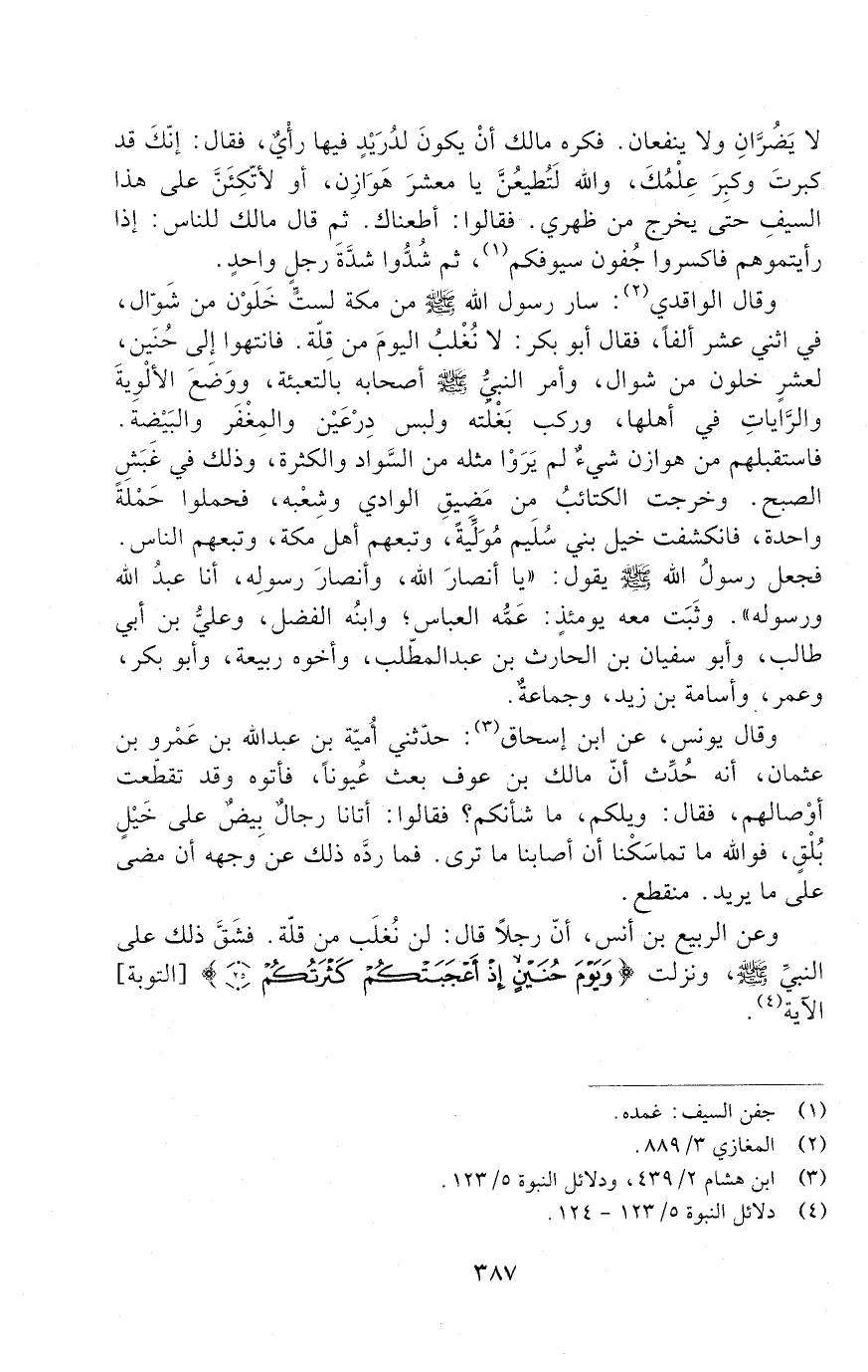 فَكَرِهَ مَالِكٌ أَنْ يَكُونَ لِدُرَيْدٍ فِيهَا رَأْيٌ، فَقَالَ: إِنَّكَ قَدْ كبرت وكبر علمك، والله لتطيعن يَا مَعْشَرَ هَوَازِنَ، أَوْ لأَتْكِئَنَّ عَلَى هَذَا السَّيْفِ حَتَّى يَخْرُجَ مِنْ ظَهْرِي! فَقَالُوا: أَطَعْنَاكَ! ثُمَّ قَالَ مَالِكٌ لِلنَّاسِ: إِذَا رَأَيْتُمُوهُمْ فَاكْسِرُوا جُفُونُ سُيُوفِكُمْ، ثُمَّ شُدُّوا شَدَّةَ رَجُلٍ وَاحِدٍ.