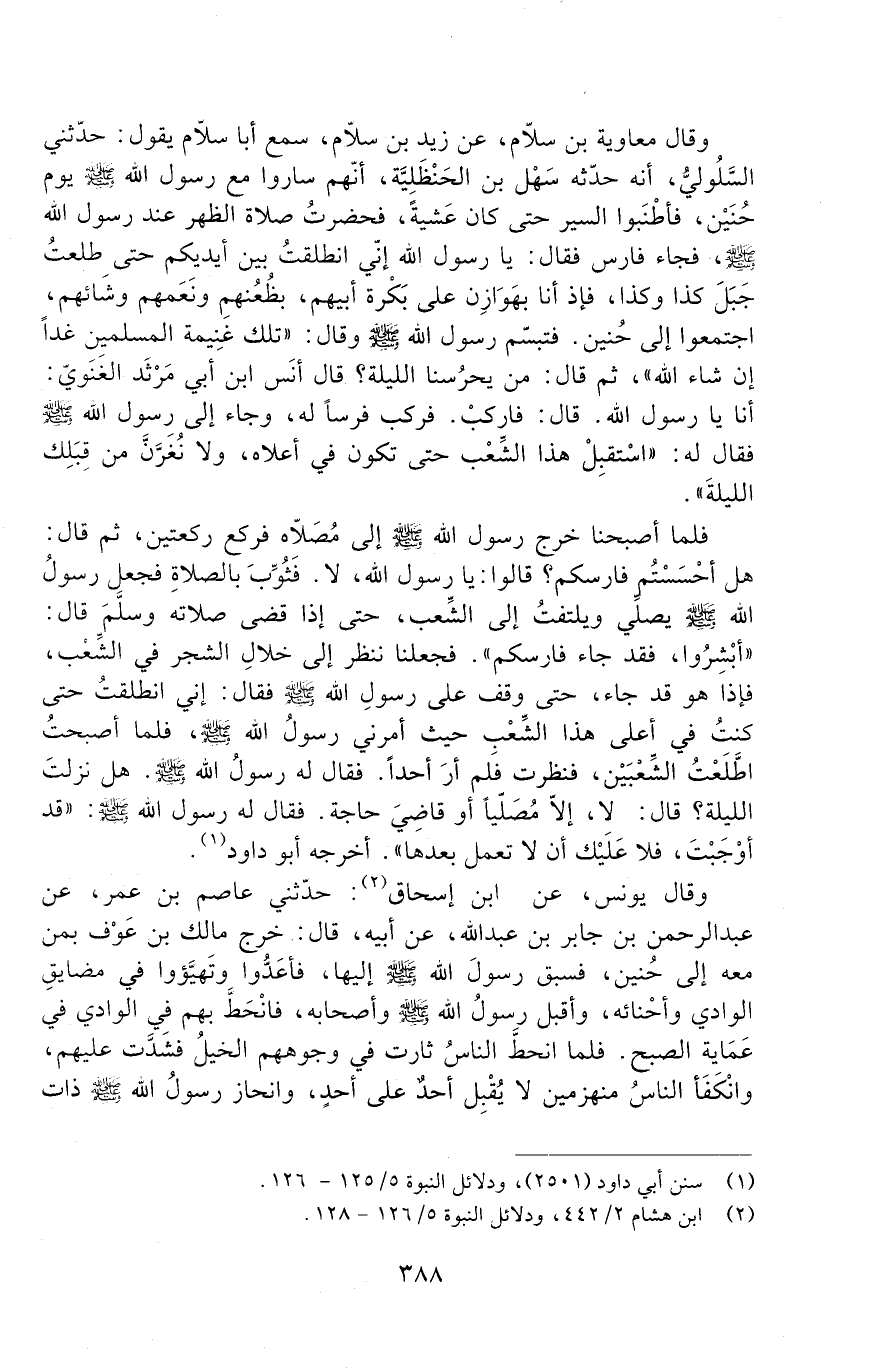 وَقَالَ يُونُسُ عَنِ ابن إسحاق: حدثني عاصم بن عمر، عن عَبْدِ الرَّحْمَنِ بْنِ جَابِرِ بْنِ عَبْدِ اللَّهِ، عَنْ أَبِيهِ قَالَ: خَرَجَ مَالِكُ بْنُ عَوْفٍ بِمَنْ مَعَهُ إِلَى حُنَيْنٍ، فَسَبَقَ رَسُولَ اللَّهِ صلى الله عليه وسلم إليها، فأعدوا وتهيؤوا فِي مَضَايِقِ الْوَادِي وَأَحْنَائِهِ، وَأَقْبَلَ رَسُولُ اللَّهِ صَلَّى اللَّهُ عَلَيْهِ وَسَلَّمَ وَأَصْحَابُهُ، فَانْحَطَّ بِهِمْ في الوادي في عماية الصبح. فلما انحط النَّاسُ ثَارَتْ فِي وُجُوهِهِمُ الْخَيْلُ فَشَدَّت عَلَيْهِمْ، وَانْكَفَأَ النَّاسُ مُنْهَزِمِينَ لا يُقْبِلُ أَحَدٌ عَلَى أَحَدٍ. وَانْحَازَ رَسُولُ اللَّهِ صَلَّى اللَّهُ عَلَيْهِ وَسَلَّمَ ذَاتَ