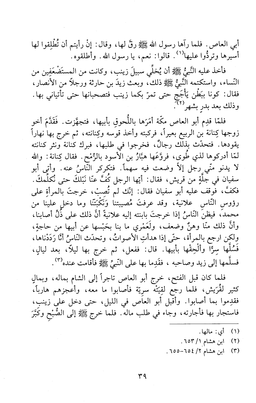فَأَخَذَ عَلَيْهِ النَّبِيُّ - صَلَّى اللَّهُ عَلَيْهِ وَسَلَّمَ - أَنْ يُخَلِّي سَبِيلَ زَيْنَبَ، وَكَانَتْ مِنَ الْمُسْتَضْعَفِينَ مِنَ النِّسَاءِ. وَاسْتَكْتَمَهُ النَّبِيُّ - صَلَّى اللَّهُ عَلَيْهِ وَسَلَّمَ - ذَلِكَ. وَبَعَثَ زَيْدَ بْنَ حَارِثَةَ وَرَجُلًا مِنَ الأنصار، فقال: كونا ببطن يأجج حتى تمر بِكُمَا زَيْنَبُ فَتَصْحَبَانَهَا حَتَّى تَأْتِيَانِي بِهَا. وَذَلِكَ بَعْدَ بَدْرٍ بِشَهْرٍ.
