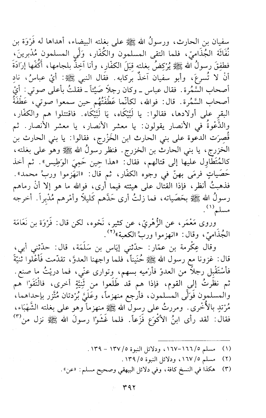 فَلَمَّا الْتَقَى الْمُسْلِمُونَ وَالْكُفَّارُ وَلَّى الْمُسْلِمُونَ مُدْبِرِينَ. فَطَفِقَ رَسُولُ اللَّهِ صَلَّى اللَّهُ عَلَيْهِ وَسَلَّمَ يَرْكُضُ بَغْلَتَهُ قِبَلَ الْكُفَّارِ، وَأَنَا آخِذٌ بِلِجَامِهَا أُكُفُّهَا إِرَادَةَ أَنْ لا تُسْرِعَ، وَأَبُو سُفْيَانَ آخِذٌ بِرِكَابِهِ. فَقَالَ النَّبِيُّ صَلَّى اللَّهُ عَلَيْهِ وَسَلَّمَ: أَيْ عَبَّاسُ، ناد أصحاب السمرة. فقال عباس - وكان رجلا صيتا -: فقلت بأعلى صوتي: أي أَصْحَابَ السَّمُرَةِ. قَالَ: فَوَاللَّهِ، لَكَأَنَّمَا عَطْفَتَهُمْ حِينَ سَمِعُوا صَوْتِي عَطْفَةُ الْبَقَرِ عَلَى أَوْلادِهَا، فَقَالُوا: يَا لَبَّيْكَاهُ، يَا لَبَّيْكَاهُ! فَاقْتَتَلُوا هُمْ وَالْكُفَّارُ.