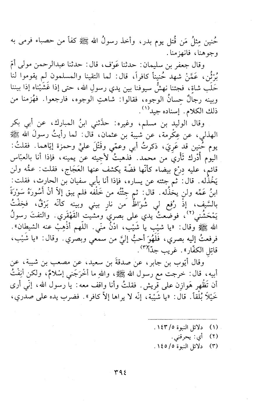 وَقَالَ الْوَلِيدُ بْنُ مُسْلِمٍ وَغَيْرُهُ: حَدَّثَنِي ابْنُ الْمُبَارَكِ عَنْ أَبِي بَكْرٍ الْهُذَلِيِّ، عَنْ عِكْرِمَةَ، عَنْ شَيْبَةَ بْنِ عُثْمَانَ قَالَ: لَمَّا رَأَيْتُ رَسُولَ اللَّهِ صَلَّى اللَّهُ عَلَيْهِ وَسَلَّمَ يَوْمَ حُنَيْنٍ قَدْ عَرِيَ، ذَكَرْتُ أَبِي وَعَمِّي وَقَتْلَ عَلِيٍّ وَحَمْزَةَ إِيَّاهُمَا. فَقُلْتُ: الْيَوْمَ أُدْرِكُ ثَأْرِي مِنْ مُحَمَّدٍ. فَذَهَبْتُ لأَجِيئَهُ عَنْ يَمِينِهِ، فَإِذَا أَنَا بِالْعَبَّاسِ قَائِمٌ عَلَيْهِ دِرْعٌ بَيْضَاءُ كَأَنَّهَا فِضَّةٌ يَكْشِفُ عَنْهَا الْعَجَاجُ. فَقُلْتُ: عَمُّهُ وَلَنْ يَخْذُلَهُ.