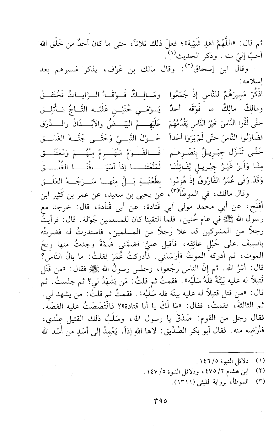 فَأَدْرَكْتُ عُمَرَ فَقُلْتُ: مَا بَالُ النَّاسِ؟ قَالَ: أَمْرُ اللَّهِ. ثُمَّ إِنَّ النَّاسَ رَجَعُوا، وَجَلَسَ رَسُولِ اللَّهِ صَلَّى اللَّهُ عَلَيْهِ وَسَلَّمَ فَقَالَ: " من قتل قتيلا له عليه بينة فله سَلَبُه ". فَقُمْتُ ثُمَّ قُلْتُ: مَنْ يَشْهَدُ لِي؟ ثُمَّ جَلَسْتُ. ثُمَّ قَالَ: " مَنْ قَتَلَ قَتِيلًا لَهُ عَلَيْهِ بَيِّنَةٌ فَلَهُ سَلَبُه ". فَقُمْتُ ثُمَّ قُلْتُ: مَنْ يَشْهَدُ لِي؟