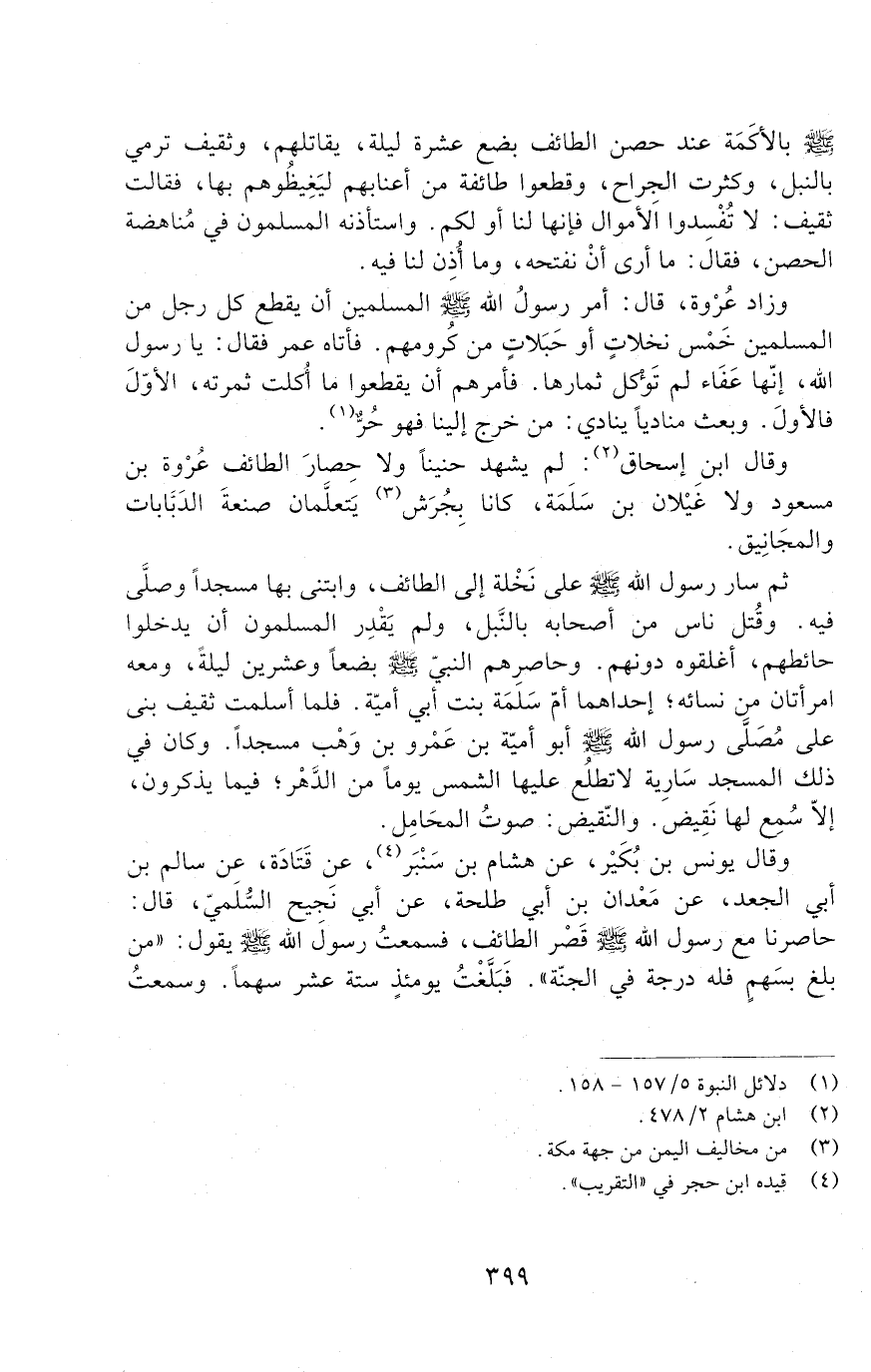 ثُمَّ سَارَ رَسُولُ اللَّهِ صَلَّى اللَّهُ عَلَيْهِ وَسَلَّمَ عَلَى نَخْلَةٍ إِلَى الطَّائِفِ، وَابْتَنَى بِهَا مَسْجِدًا وَصَلَّى فِيهِ. وَقُتِلَ نَاسٌ مِنْ أَصْحَابِهِ بِالنَّبْلِ. وَلَمْ يَقْدِرِ الْمُسْلِمُونَ أَنْ يَدْخُلُوا حَائِطَهُمْ، أَغْلَقُوهُ دُونَهُمْ. وَحَاصَرَهُمُ النَّبِيُّ صَلَّى اللَّهُ عَلَيْهِ وَسَلَّمَ بِضْعًا وَعِشْرِينَ لَيْلَةً، وَمَعَهُ امْرَأَتَانِ مِنْ نِسَائِهِ؛ إِحْدَاهُمَا أُمُّ سَلَمَةَ بِنْتُ أَبِي أُمَيَّةَ. فَلَمَّا أَسْلَمَتْ ثَقِيفٌ بَنَى عَلَى مُصَلَّى رَسُولِ اللَّهِ صَلَّى اللَّهُ عَلَيْهِ وَسَلَّمَ أَبُو أُمَيَّةَ بْنُ عَمْرِو بْنِ وَهْبٍ مَسْجِدًا. وَكَانَ فِي ذَلِكَ الْمَسْجِدِ سَارِيَةٌ لا تَطْلُعُ عَلَيْهَا الشَّمْسُ يَوْمًا مِنَ الدَّهْرِ؛ فِيمَا يَذْكُرُونَ، إِلا سُمِعَ لَهَا نَقِيضٌ. وَالنَّقِيضُ صَوْتُ الْمَحَامِلِ.