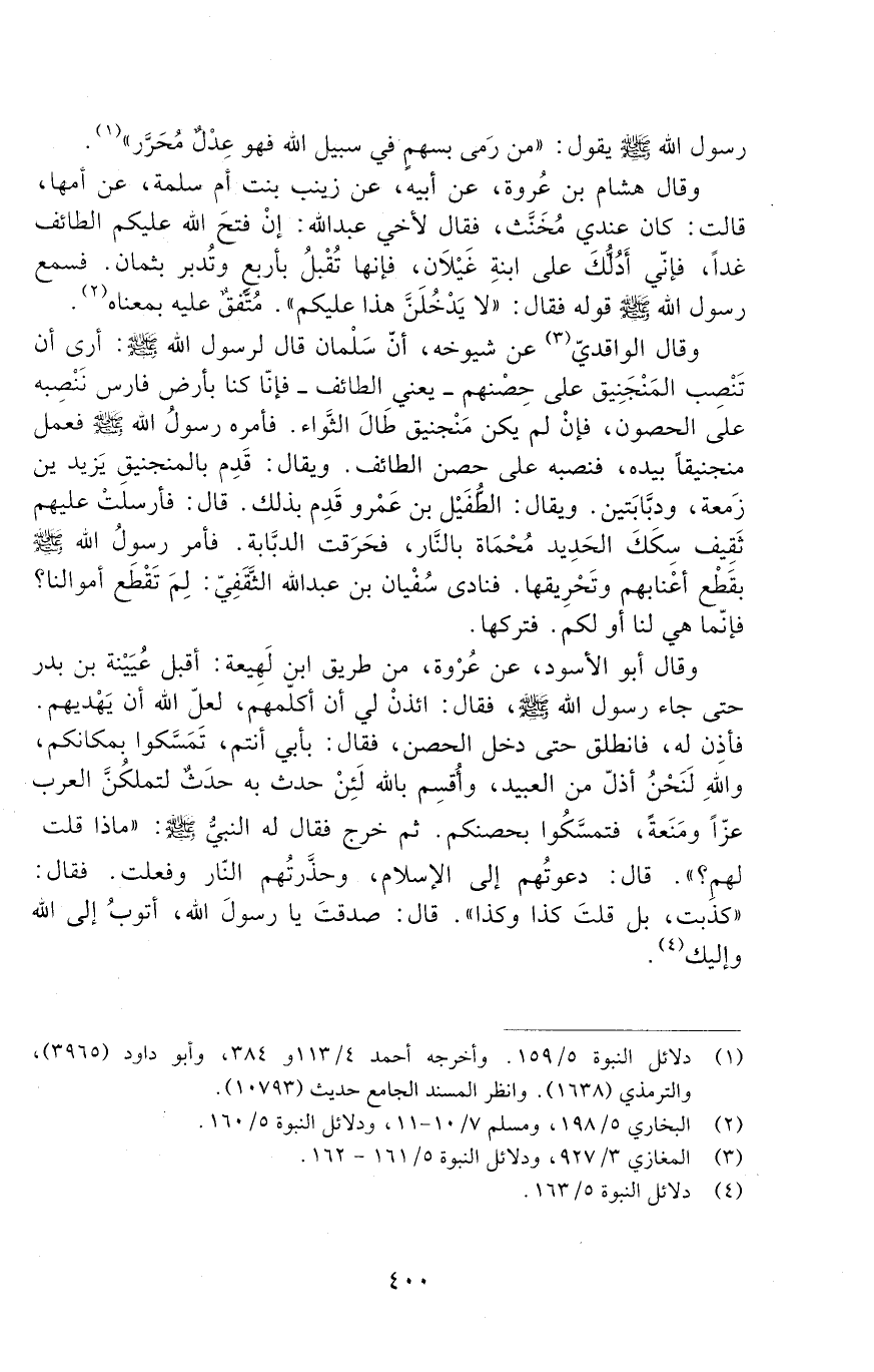 وقال الواقدي عن شيوخه، أن سلمان قال لرسول الله صَلَّى اللَّهُ عَلَيْهِ وَسَلَّمَ: أرى أنَّ تَنْصِب المَنْجِنيق عَلَى حِصْنهم - يعني الطائف - فإنّا كُنَّا بأرض فارس نَنْصِبه عَلَى الحصون، فإنْ لم يكن مَنْجنيق طَالَ الثَّواء. فأمره رَسُول اللَّهِ صَلَّى اللَّهُ عَلَيْهِ وَسَلَّمَ فعمل منجنيقًا بيده، فنصبه عَلَى حصن الطائف. ويقال: قدِم بالمنجنيق يَزيد بْن زَمعة، ودبَّابَتْين. ويقال: الطُّفَيْلُ بْن عَمْرو قَدِم بذلك. قَالَ: فأرسلت عليهم ثقيف سكك الحديد محماة بالنار، فحرقت الدبابة. فأمر رسول الله صَلَّى اللَّهُ عَلَيْهِ وَسَلَّمَ بقطع أَعْنابهم وتَحْرِيقها. فنادى سُفْيَان بْن عَبْد اللَّه الثقفي: لم تقطع أموالنا؟ فإنّما هِيَ لنا أو لكم. فتركها.