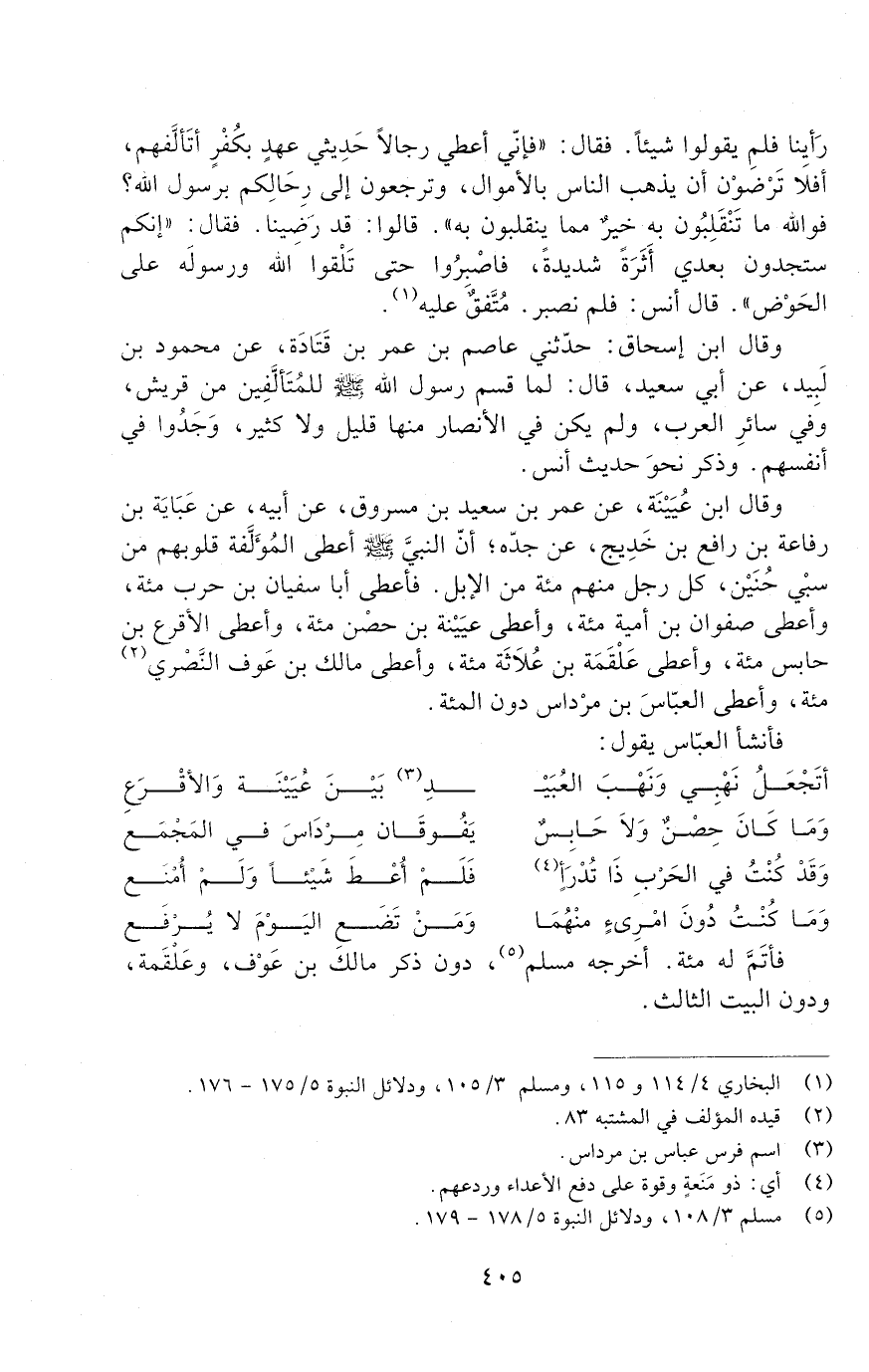 وَقَالَ ابْنُ عُيَيْنَةَ، عَنْ عُمَرَ بْنِ سَعِيدِ بْنِ مَسْرُوقٍ، عَنْ أَبِيهِ، عَنْ عَبَايَةَ بْنِ رِفَاعَةَ بْنِ رَافِعِ بْنِ خَدِيجٍ، عَنْ جَدِّهِ؛ إِنَّ النَّبِيَّ صَلَّى اللَّهُ عَلَيْهِ وَسَلَّمَ أَعْطَى الْمُؤَلَّفَةَ قُلُوبُهُمْ مِنْ سَبْيِ حُنَيْنٍ، كُلُّ رَجُلٍ مِنْهُمْ مِائَةً مِنَ الإِبِلِ. فَأَعْطَى أَبَا سُفْيَانَ بْنَ حَرْبٍ مِائَةً، وَأَعْطَى صَفْوَانَ بْنَ أُمَيَّةَ مِائَةً. وَأَعْطَى عُيَيْنَةَ بْنَ حِصْنٍ مِائَةً، وَأَعْطَى الأَقْرَعَ بْنَ حَابِسٍ مِائَةً، وَأَعْطَى عَلْقَمَةَ بْنَ عُلاثَةَ مِائَةً، وَأَعْطَى مَالِكَ بْنَ عَوْفٍ النَّصْرِيَّ مِائَةً، وَأَعْطَى الْعَبَّاسَ بْنَ مِرْدَاسٍ دُونَ الْمِائَةِ.