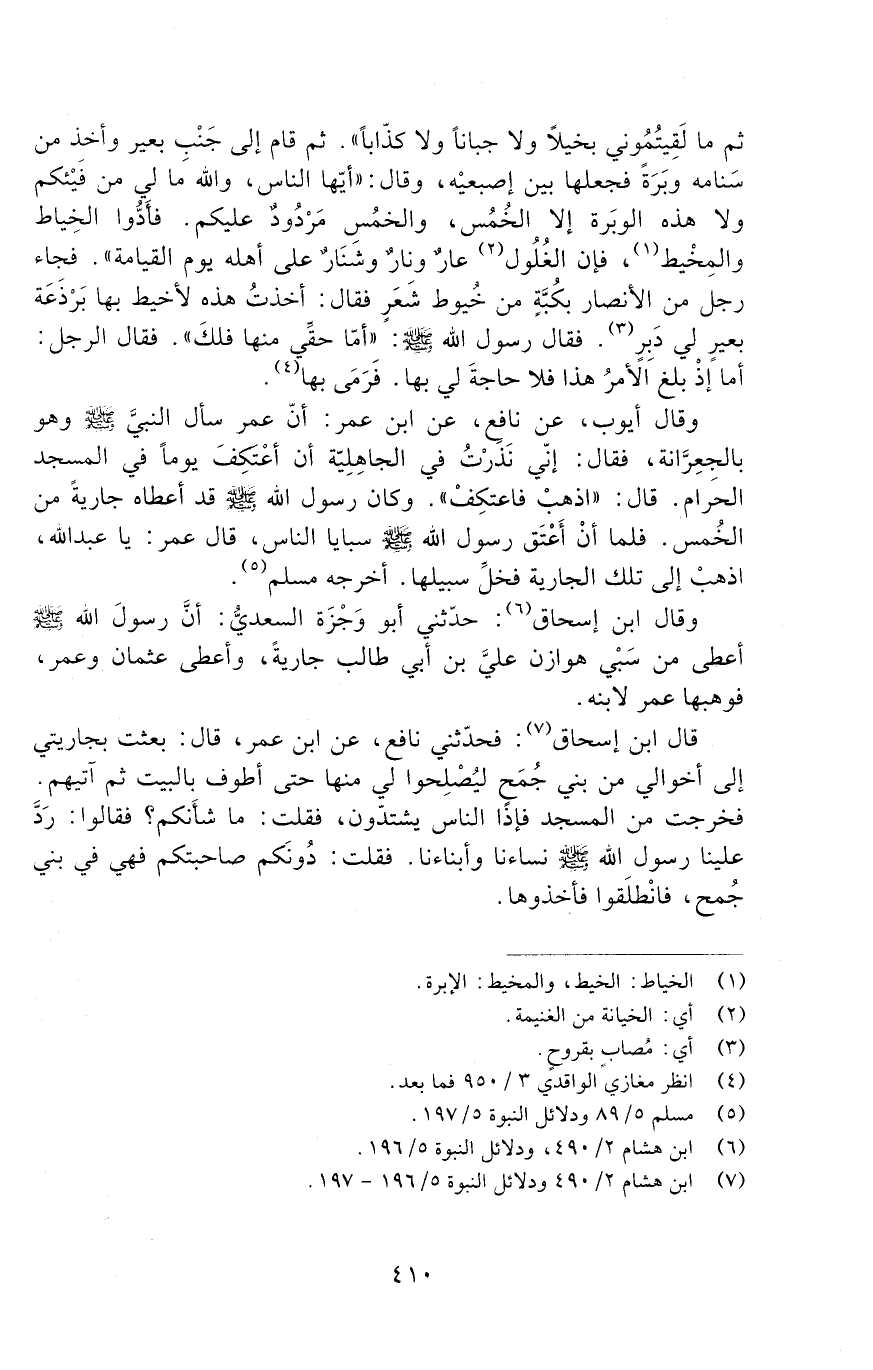 ثُمَّ مَا لَقِيتُمُونِي بَخِيلًا وَلَا جَبَانًا وَلَا كَذَّابًا ". ثُمَّ قَامَ إِلَى جَنْبِ بَعِيرٍ وَأَخَذَ مِنْ سَنَامَه وَبَرَةً فَجَعَلَهَا بَيْنَ إِصْبَعَيْهِ وَقَالَ: " أيها الناس، والله ما لي مِنْ فَيْئِكُمْ وَلَا هَذِهِ الْوَبَرَةِ إِلَّا الْخُمُسُ، وَالْخُمُسُ مَرْدُودٌ عَلَيْكُمْ. فَأَدُّوا الْخِيَاطَ وَالْمِخْيَطَ، فَإِنَّ الْغُلُولَ عَارٌ وَنَارٌ وَشَنَارٌ عَلَى أَهْلِهِ يَوْمَ الْقِيَامَةِ ". فَجَاءَ رَجُلٌ مِنَ الْأَنْصَارِ بِكُبَّةٍ مِنْ خِيُوطِ شَعْرٍ فَقَالَ: أَخَذْتُ هَذِهِ لِأَخِيطَ بِهَا بَرْذَعَةَ بَعِيرٍ لِي دَبِرٍ. فَقَالَ رَسُولُ اللَّهِ صَلَّى اللَّهُ عَلَيْهِ وَسَلَّمَ: " أَمَّا حَقِّي مِنْهَا فلك ". فقال الرجل: أما إذ بَلَغَ الْأَمْرُ هَذَا فَلا حَاجَةَ لِي بِهَا. فَرَمَى بِهَا.