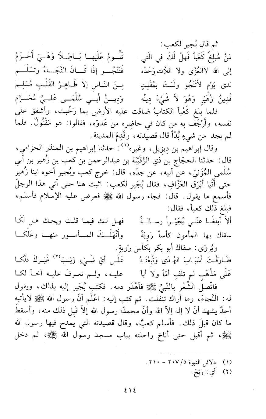 فاتّصل الشِعْر بالنّبيّ صَلَّى اللَّهُ عَلَيْهِ وَسَلَّمَ فأهْدَر دمه. فكتب بُجَير إِلَيْهِ بذلك، ويقول لَهُ: النَّجاءَ، وما أراك تنفلت. ثمّ كتب إِلَيْهِ: اعَلْم أَنَّ رَسُول اللَّهِ صَلَّى اللَّهُ عَلَيْهِ وَسَلَّمَ لَا يأتيه أحد يشهد أَنْ لَا إِلَهَ إِلا اللَّهُ وَأَنَّ مُحَمَّدًا رَسُول اللَّهِ إلّا قَبِلَ ذَلِكَ منه، وأسقط ما كَانَ قبل ذَلِكَ. فأسلم كَعْب، وقال قصيدته التي يمدح فيها رَسُول اللَّهِ صَلَّى اللَّهُ عَلَيْهِ وَسَلَّمَ، ثم أقبل حتّى أناخ راحلته بباب مَسْجِدَ رَسُول اللَّهِ صَلَّى اللَّهُ عَلَيْهِ وَسَلَّمَ، ثمّ دخل