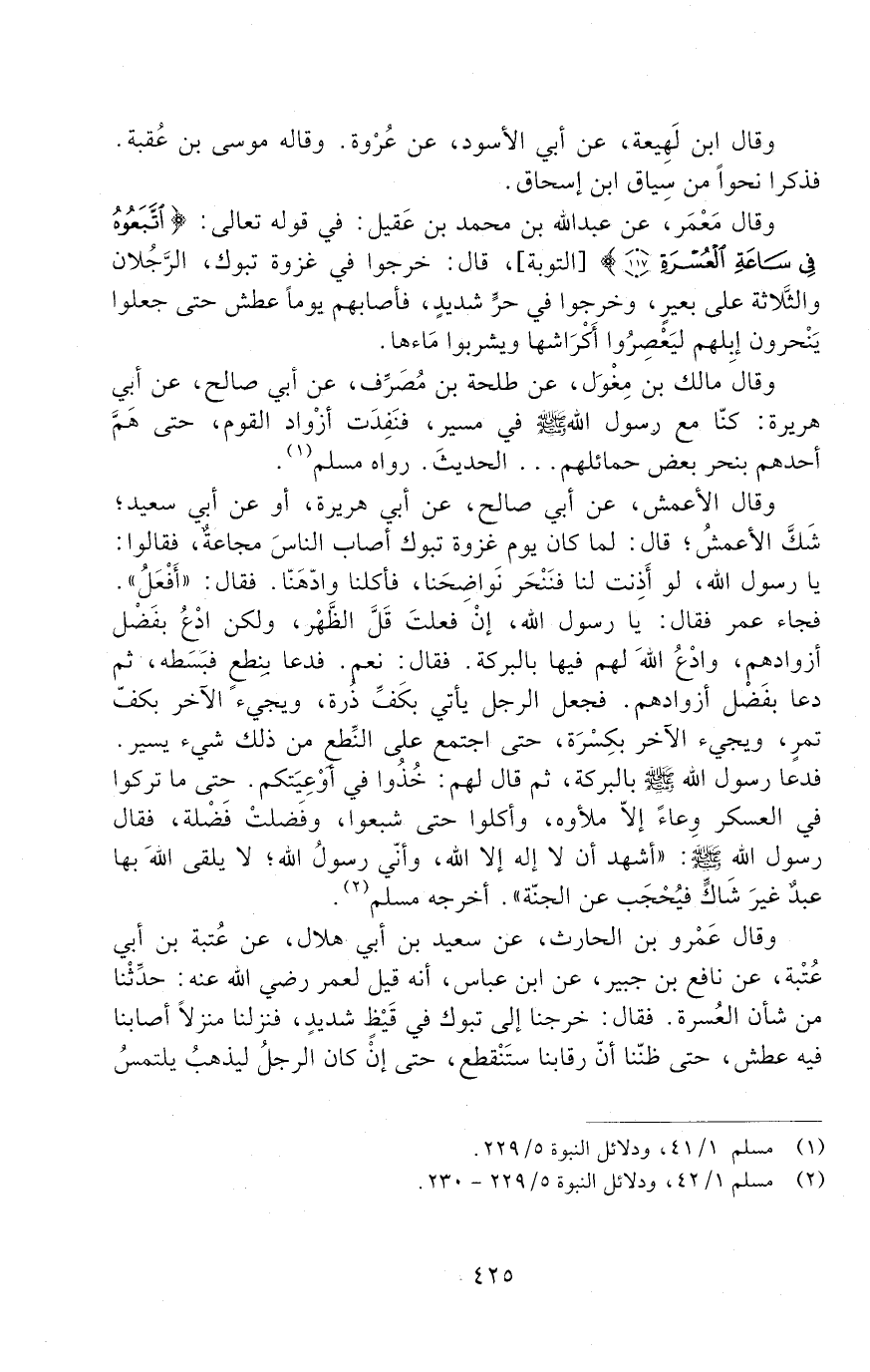 وَقَالَ مَالِكُ بْنُ مِغْوَلٍ، عَنْ طَلْحَةَ بْنِ مُصَرِّفٍ، عَنْ أَبِي صَالِحٍ، عَنْ أَبِي هُرَيْرَةَ: كُنَّا مَعَ رَسُولِ اللَّهِ صَلَّى اللَّهُ عَلَيْهِ وَسَلَّمَ فِي مَسِيرٍ، فَنَفِدَتْ أَزْوَادُ الْقَوْمِ، حَتَّى هَمَّ أَحَدُهُمْ بِنَحْرِ بَعْضِ حَمَائِلِهِمْ .. الْحَدِيثَ. رَوَاهُ مُسْلِمٌ.