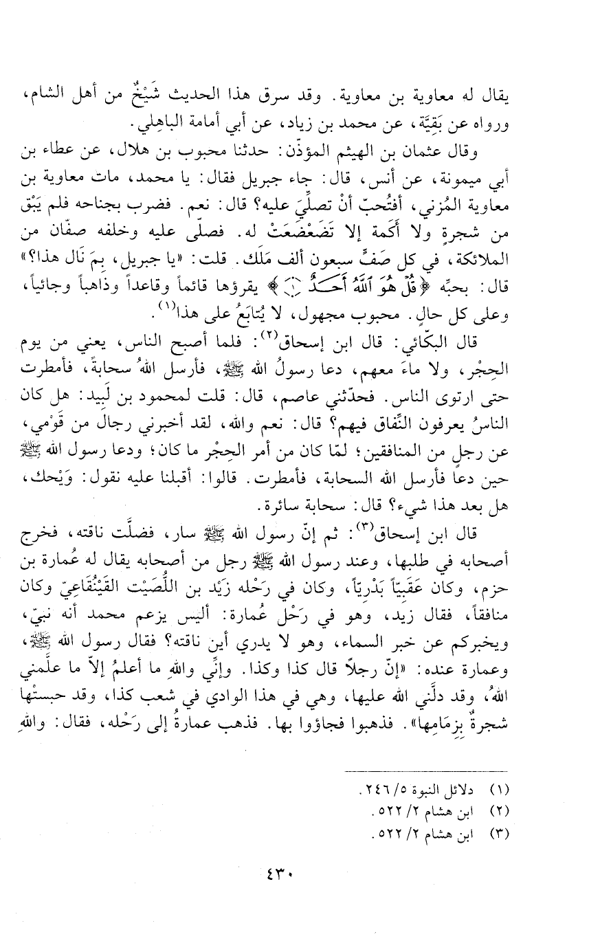 قَالَ الْبَكَّائِيُّ: قَالَ ابْنُ إِسْحَاقَ: فَلَمَّا أَصْبَحَ النَّاسُ، يَعْنِي مِنْ يَوْمِ الْحِجْرِ، وَلا مَاءَ مَعَهُمْ، دَعَا رسول الله صَلَّى اللَّهُ عَلَيْهِ وَسَلَّمَ، فأرسل اللَّهُ سَحَابَةً، فَأَمْطَرَتْ حَتَّى ارْتَوَى النَّاسُ. فَحَدَّثَنِي عَاصِمٌ، قَالَ: قُلْتُ لِمَحْمُودِ بْنِ لَبِيدٍ: هَلْ كَانَ النَّاسُ يَعْرِفُونَ النِّفَاقَ فِيهِمْ؟ قَالَ: نَعَمْ وَاللَّهِ، لَقَدْ أَخْبَرَنِي رِجَالٌ مِنْ قَوْمِي، عَنْ رَجُلٍ مِنَ الْمُنَافِقِينَ؛ لَمَّا كَانَ مِنْ أَمْرِ الْحِجْرِ مَا كَانَ؛ وَدَعَا رَسُولُ اللَّهِ صَلَّى اللَّهُ عَلَيْهِ وَسَلَّمَ حِينَ دَعَا فَأَرْسَلَ اللَّهُ السَّحَابَةَ، فَأَمْطَرَتْ. قَالُوا: أَقْبَلْنَا عَلَيْهِ نَقُولُ: وَيْحَكَ، هَلْ بَعْدَ هَذَا شَيْءٌ؟ قَالَ: سَحَابَةٌ سَائِرَةٌ.