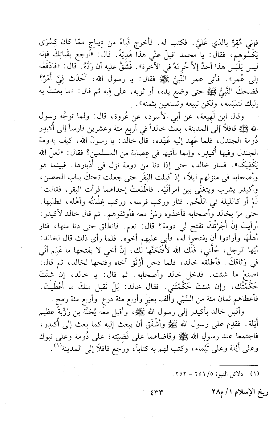 وَأَقْبَلَ خَالِدٌ بِأُكَيْدِرٍ إِلَى رَسُولِ اللَّهِ صَلَّى اللَّهُ عَلَيْهِ وَسَلَّمَ، وَأَقْبَلَ مَعَهُ يُحَنَّةُ بْنُ رُؤْبَةَ عَظِيمُ أَيْلَةَ. فَقَدِمَ عَلَى رَسُولِ اللَّهِ صَلَّى اللَّهُ عَلَيْهِ وَسَلَّمَ وأَشْفَقَ أَنْ يَبْعَثَ إِلَيْهِ كَمَا بعث إلى أكيدر. فاجتمعا عِنْدَ رَسُولِ اللَّهِ صَلَّى اللَّهُ عَلَيْهِ وَسَلَّمَ وَقَاضَاهُمَا عَلَى قَضِيَّتِهِ؛ عَلَى دُومَةَ وَعَلَى تَبُوكَ وعلى أيلة وعلى تيماء، وكتب لهم به كِتَابًا. وَرَجَعَ قَافِلا إِلَى الْمَدِينَةِ.