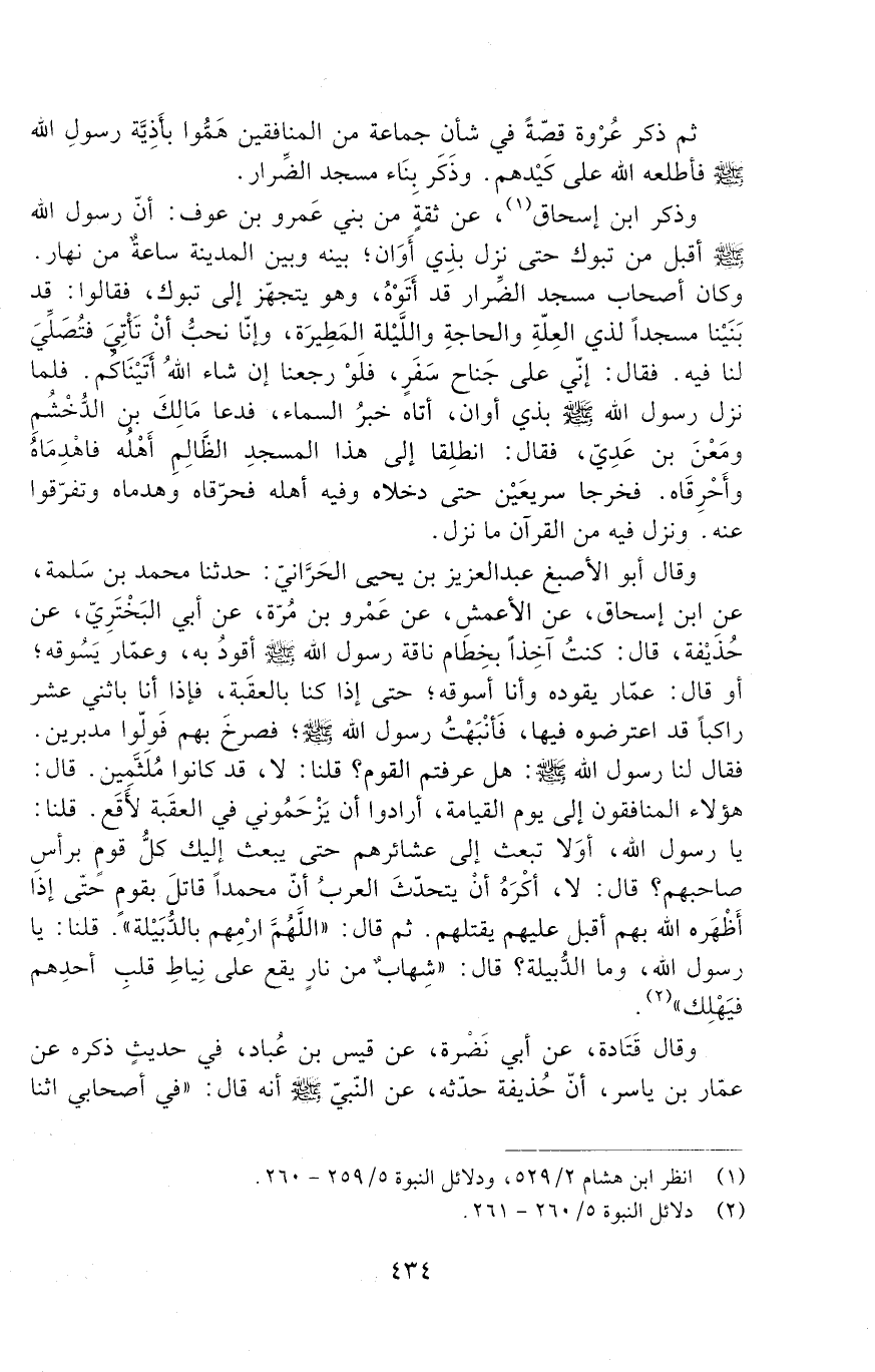 ثُمَّ ذَكَرَ عُرْوَةُ قِصَّةً فِي شَأْنِ جَمَاعَةٍ مِنَ الْمُنَافِقِينَ هَمُّوا بِأَذِيَّةِ رَسُولِ اللَّهِ صَلَّى اللَّهُ عَلَيْهِ وَسَلَّمَ فَأَطْلَعَهُ اللَّهُ عَلَى كَيْدِهِمْ. وذكر بناء مسجد الضرار.