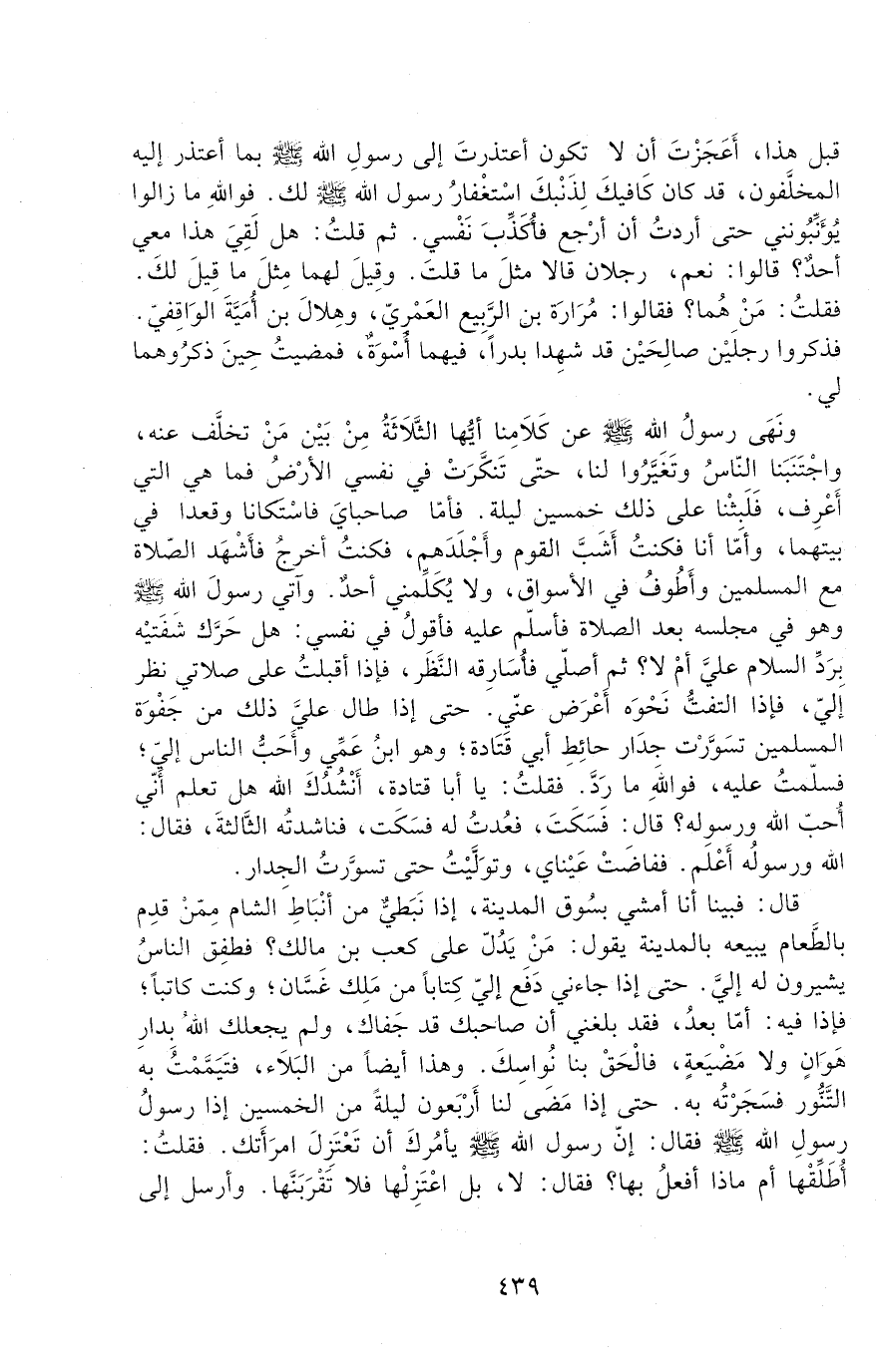 وَنَهَى رَسُولُ اللَّهِ صَلَّى اللَّهُ عَلَيْهِ وَسَلَّمَ عَنْ كَلامِنَا أَيُّهَا الثَّلاثَةُ مِنْ بَيْنِ مَنْ تَخَلَّفَ عَنْهُ. وَاجْتَنَبَنَا النَّاسُ وتَغَيَّرُوا لَنَا، حَتَّى تَنَكَّرَتْ فِي نَفْسِي الأَرْضُ فَمَا هِيَ الَّتِي أَعْرِفُ. فَلَبِثْنَا عَلَى ذَلِكَ خَمْسِينَ لَيْلَةً. فَأَمَّا صَاحِبَايَ فَاسْتَكَانَا وَقَعَدَا فِي بَيْتِهِمَا. وَأَمَّا أَنَا فَكُنْتُ أَشَبَّ الْقَوْمِ وَأَجْلَدَهُمْ، فَكُنْتُ أَخْرُجُ فَأَشْهَدُ الصَّلاةَ مَعَ الْمُسْلِمِينَ وأطوف في الأسواق، ولا يُكَلِّمُنِي أَحَدٌ. وَآتِي رَسُولَ اللَّهِ صَلَّى اللَّهُ عَلَيْهِ وَسَلَّمَ وَهُوَ فِي مَجْلِسِهِ بَعْدَ الصَّلاةِ فَأُسَلِّمُ عَلَيْهِ فَأَقُولُ فِي نَفْسِي: هَلْ حَرَّكَ شَفَتَيْهِ بِرَدِّ السَّلامِ عَلَيَّ أَمْ لا؟ ثُمَّ أُصَلِّي فَأُسَارِقُهُ النَّظَرَ، فَإِذَا أَقْبَلْتُ عَلَى صَلاتِي نَظَرَ إِلَيَّ، فَإِذَا الْتَفَتُّ نَحْوَهُ أَعْرَضَ عَنِّي. حَتَّى إِذَا طَالَ عَلَيَّ ذَلِكَ مِنْ جَفْوَةِ الْمُسْلِمِينَ تَسَوَّرْتُ جِدَارَ حَائِطِ أَبِي قَتَادَةَ؛ وَهُوَ ابْنُ عَمِّي وَأَحَبُّ النَّاسِ إِلَيَّ؛ فَسَلَّمْتُ عَلَيْهِ، فَوَاللَّهِ مَا رَدَّ. فَقُلْتُ: يَا أَبَا قَتَادَةَ، أَنْشُدُكَ اللَّهَ هَلْ تَعْلَمُ أَنِّي أُحِبُّ اللَّهَ وَرَسُولَهُ؟ قَالَ: فسَكَتَ، فَعُدْتُ لَهُ فَسَكَتَ، فَنَاشَدْتُهُ الثَّالِثَةَ فَقَالَ: اللَّهُ وَرَسُولُهُ أَعْلَمُ. فَفَاضَتْ عَيْنَايَ. وَتَوَلَّيْتُ حَتَّى تَسَوَّرْتُ الْجِدَارَ.