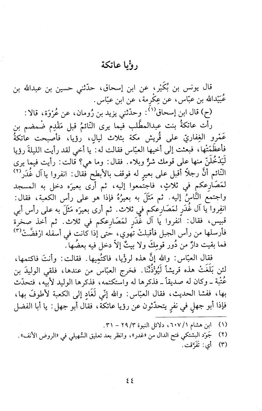 (ح) قَالَ ابْنُ إِسْحَاقَ: وحدثني يزيد بن رومان، عن عروة قالا: رَأَتْ عَاتِكَةُ بِنْتُ عَبْدِ الْمُطَّلِبِ فِيمَا يَرَى النَّائِمُ قَبْلَ مَقْدِمِ ضَمْضَمِ بْنِ عَمْرٍو الْغِفَارِيِّ عَلَى قُرَيْشِ مَكَّةَ بِثَلَاثِ لَيَالٍ، رُؤْيَا، فَأَصْبَحَتْ عَاتِكَةُ فَأَعْظَمَتْهَا، فَبَعَثَتْ إِلَى أَخِيهَا الْعَبَّاسَ فَقَالَتْ لَهُ: يَا أَخِي لَقَدْ رَأَيْتُ اللَّيْلَةَ رُؤْيَا لَيَدْخُلَنَّ مِنْهَا عَلَى قَوْمِكَ شَرٌّ وَبَلَاءٌ. فَقَالَ: وما هي؟ قالت: رَأَيْتُ فِيمَا يَرَى النَّائِمُ أَنَّ رَجُلًا أَقْبَلَ عَلَى بَعِيرٍ لَهُ فَوَقَفَ بِالْأَبْطَحِ فَقَالَ: انْفِرُوا يَا آلَ غُدُرٍ لِمَصَارِعِكُمْ فِي ثَلَاثٍ، فَاجْتَمَعُوا إِلَيْهِ، ثُمَّ أُرِيَ بَعِيرَهُ دَخَلَ بِهِ الْمَسْجِدَ وَاجْتَمَعَ النَّاسُ إِلَيْهِ. ثُمَّ مَثَلَ بِهِ بَعِيرُهُ فَإِذَا هُوَ عَلَى رَأْسِ الْكَعْبَةِ، فَقَالَ: انْفِرُوا يا آل غدر لمصارعكم في ثلاث. ثم أُرِيَ بَعِيرَهُ مَثَلَ بِهِ عَلَى رَأْسِ أَبِي قُبَيْسٍ، فَقَالَ: انْفِرُوا يَا آلَ غَدْرٍ لِمَصَارِعِكُمْ فِي ثَلاثٍ. ثُمَّ أَخَذَ صَخْرَةً فَأَرْسَلَهَا مِنْ رَأْسِ الْجَبَلِ فَأَقْبَلَتْ تَهْوِي، حَتَّى إِذَا كَانَتْ فِي أَسْفَلِهِ ارْفَضَّتْ فَمَا بَقِيَتْ دَارٌ مِنْ دور قومك وَلَا بَيْتٌ إِلَّا دَخَلَ فِيهِ بَعْضُهَا.