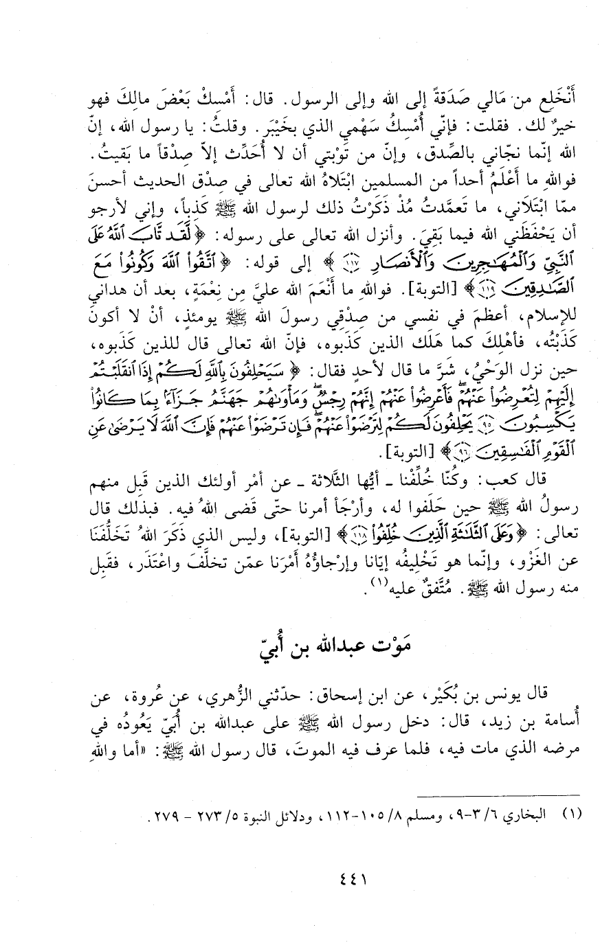 أَنْخَلِعَ مِنْ مَالِي صَدَقَةً إِلَى اللَّهِ وَإِلَى الرَّسُولِ. قَالَ: أَمْسِكْ بَعْضَ مَالِكَ فَهُوَ خَيْرٌ لَكَ. فَقُلْتُ: فَإِنِّي أُمْسِكُ سَهْمِي الَّذِي بِخَيْبَرَ. وَقُلْتُ: يَا رَسُولَ اللَّهِ، إِنَّ اللَّهَ إِنَّمَا نَجَّانِي بِالصِّدْقِ، وَإِنَّ مِنْ تَوْبَتِي أَنْ لا أُحَدِّثَ إِلا صِدْقًا مَا بَقِيتُ. فَوَاللَّهِ مَا أَعْلَمُ أَحَدًا مِنَ الْمُسْلِمِينَ ابْتَلاهُ اللَّهُ تَعَالَى فِي صِدْقِ الْحَدِيثِ أَحْسَنَ مِمَّا ابْتَلانِي، مَا تَعمَّدْتُ مُذْ ذَكَرْتُ ذَلِكَ لِرَسُولِ اللَّهِ صَلَّى اللَّهُ عَلَيْهِ وَسَلَّمَ كَذِبًا، وَإِنِّي لأَرْجُو أَنْ يَحْفَظَنِي اللَّهُ فِيمَا بَقِيَ. وَأَنْزَلَ اللَّهُ تَعَالَى عَلَى رَسُولِهِ: {لَقَدْ تَابَ اللَّهُ عَلَى النَّبِيِّ وَالْمُهَاجِرِينَ وَالأَنْصَارِ} إِلَى قَوْلِهِ: {اتَّقُوا اللَّهَ وَكُونُوا مَعَ الصَّادِقِينَ}. فَوَاللَّهِ مَا أَنْعَمَ اللَّهُ عَلَيَّ مِنْ نِعْمَةٍ، بَعْدَ أَنْ هَدَانِي لِلإِسْلامِ، أَعْظَمَ فِي نَفْسِي مِنْ صِدْقِي رَسُولَ اللَّهِ صَلَّى اللَّهُ عَلَيْهِ وَسَلَّمَ يَوْمَئِذٍ، أَنْ لا أَكُونَ كَذَبْتُهُ، فَأَهْلِكَ كَمَا هَلَكَ الَّذِينَ كَذَّبُوهُ، فَإِنَّ اللَّهَ تَعَالَى قَالَ لِلَّذِينَ كَذَّبُوهُ حِينَ نَزَلَ الْوَحْيُ شَرَّ مَا قَالَ لأَحَدٍ، فَقَالَ: {سَيَحْلِفُونَ بِاللَّهِ لَكُمْ إِذَا انْقَلَبْتُمْ إِلَيْهِمْ لِتُعْرِضُوا عَنْهُمْ فَأَعْرِضُوا عَنْهُمْ إِنَّهُمْ رِجْسٌ وَمَأْوَاهُمْ جَهَنَّمُ جَزَاءً بِمَا كَانُوا يَكْسِبُونَ} {يَحْلِفُونَ لَكُمْ لِتَرْضَوْا عَنْهُمْ فَإِنْ تَرْضَوْا عَنْهُمْ فَإِنَّ اللَّهَ لا يَرْضَى عَنِ الْقَوْمِ الْفَاسِقِينَ}.