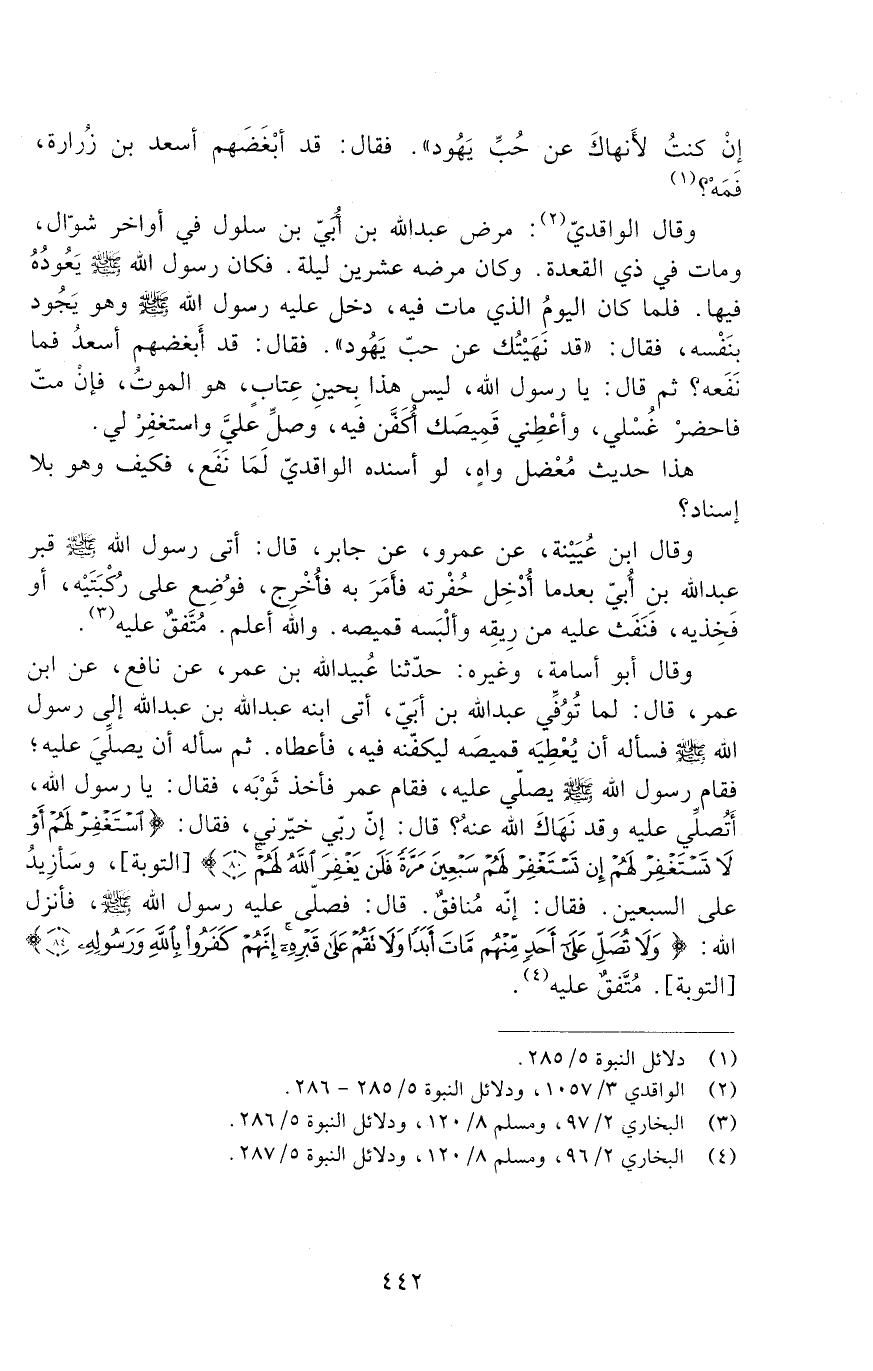 وَقَالَ أَبُو أُسَامَةَ، وَغَيْرُهُ: حَدَّثَنَا عُبَيْدُ اللَّهِ بْنُ عُمَرَ، عَنْ نَافِعٍ، عَنِ ابْنِ عُمَرَ، قَالَ: لَمَّا تُوُفِّيَ عَبْدُ اللَّهِ بْنُ أُبَيٍّ، أَتَى ابْنُهُ عَبْدُ الله بن عَبْدُ اللَّهِ إِلَى رَسُولِ اللَّهِ صَلَّى اللَّهُ عَلَيْهِ وَسَلَّمَ فَسَأَلَهُ أَنْ يُعْطِيَهُ قَمِيصَهُ لِيُكَفِّنَهُ فِيهِ، فَأَعْطَاهُ. ثُمَّ سَأَلَهُ أَنْ يُصَلِّيَ عَلَيْهِ؛ فَقَامَ رَسُولُ اللَّهِ صَلَّى اللَّهُ عَلَيْهِ وَسَلَّمَ يُصَلِّي عليه، فقام عمر فأخذ ثوبه فقال: يا رسول الله، أتصلي عليه وقد نهاك الله عنه؟ قَالَ: إِنَّ رَبِّي خَيَّرَنِي، فَقَالَ: {اسْتَغْفِرْ لَهُمْ أَوْ لا تَسْتَغْفِرْ لَهُمْ إِنْ تَسْتَغْفِرْ لَهُمْ سَبْعِينَ مَرَّةً فَلَنْ يَغْفِرَ اللَّهُ لَهُمْ}، وَسَأَزِيدُ عَلَى السَّبْعِينَ. فَقَالَ: إِنَّهُ مُنَافِقٌ. قَالَ: فَصَلَّى عَلَيْهِ رَسُولُ اللَّهِ صَلَّى اللَّهُ عَلَيْهِ وَسَلَّمَ، فَأَنزَلَ اللَّهُ: {وَلا تُصَلِّ عَلَى أَحَدٍ مِنْهُمْ مَاتَ أَبَدًا وَلا تَقُمْ عَلَى قَبْرِهِ إِنَّهُمْ كَفَرُوا بِاللَّهِ وَرَسُولِهِ}. مُتَّفَقٌ عَلَيْهِ.