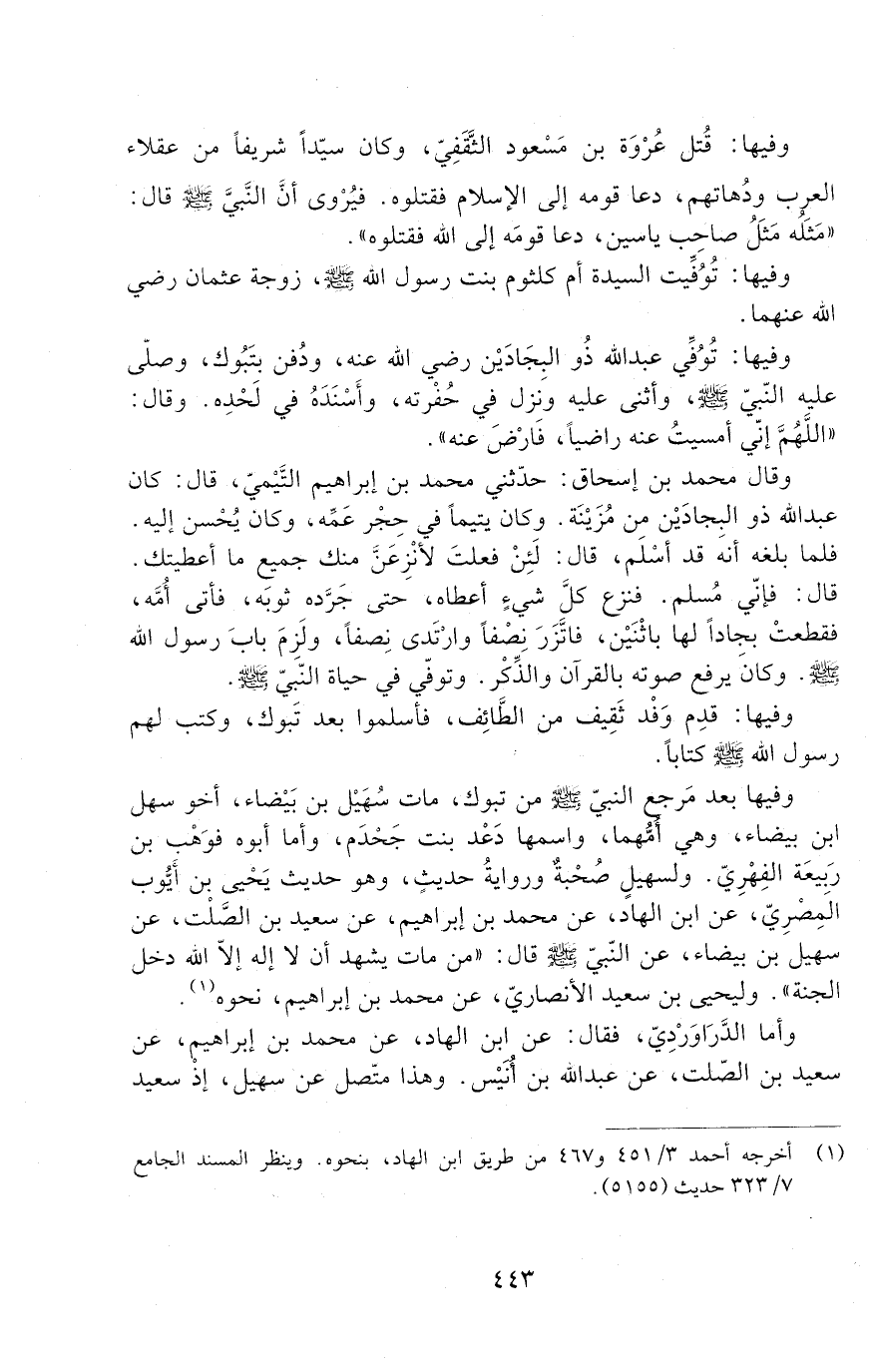 وفيها: بعد مَرجعَ النّبيّ صَلَّى اللَّهُ عَلَيْهِ وَسَلَّمَ من تبوك، مات سهيل ابن بيضاء، أخو سهل ابن بيضاء، وهي أمهما، واسمها دَعْد بِنْت جَحْدَم. وأما أَبُوهُ فوَهْب بْن رَبِيعَة الفِهْرِيّ. ولسهيل صُحْبةٌ وروايةٌ حديثٍ، وَهُوَ حَدِيثُ يَحْيَى بْنِ أَيُّوبَ الْمِصْرِيِّ، عَنِ ابْنِ الْهَادِ، عَنْ مُحَمَّدِ بْنِ إِبْرَاهِيمَ، عَنْ سَعِيدِ بن الصلت، عن سهيل ابن بَيْضَاءَ، عَنِ النَّبِيِّ صَلَّى اللَّهُ عَلَيْهِ وَسَلَّمَ قَالَ: " مَنْ مَاتَ يَشْهَدُ أَنْ لَا إِلَهَ إِلا اللَّهُ دَخَلَ الْجَنَّةَ ". وَلِيَحْيَى بْنِ سَعِيدٍ الأَنْصَارِيِّ، عَنْ مُحَمَّدِ بْنِ إِبْرَاهِيمَ - نَحْوَهُ.