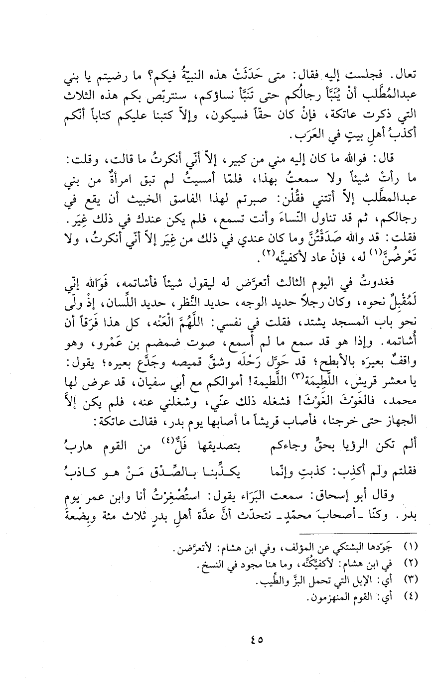 فَغَدَوْتُ فِي الْيَوْمِ الثَّالِثِ أَتَعَرَّضُ لَهُ لِيَقُولَ شَيْئًا فُأَشَاتِمَهُ. فَوَاللَّهِ إِنِّي لَمُقْبِلٌ نَحْوَهُ، وَكَانَ رَجُلًا حَدِيدَ الْوَجْهِ، حَدِيدَ النَّظَرِ، حَدِيدَ اللِّسَانِ، إِذْ وَلَّى نَحْوَ بَابِ الْمَسْجِدِ يَشْتَدَّ. فَقُلْتُ فِي نَفْسِي: اللَّهُمَّ الْعَنْهُ، كُلُّ هَذَا فَرَقًا أَنْ أُشَاتِمَهُ. وَإِذَا هُوَ قَدْ سَمِعَ مَا لم أسمع، صوت ضمضم بن عمرو، وهو واقف بَعِيرِهِ بِالْأَبْطَحِ؛ قَدْ حَوَّلَ رَحْلَهُ وَشَقَّ قَمِيصَهُ وَجَدَّعَ بَعِيرَهُ؛ يَقُولُ: يَا مَعْشَرَ قُرَيْشٍ، اللَّطِيمَةَ اللَّطِيمَةَ! أَمْوَالُكُمْ مَعَ أَبِي سُفْيَانَ، قَدْ عَرَضَ لَهَا مُحَمَّدٌ، فَالْغَوْثَ الْغَوْثَ! فَشَغَلَهُ ذَلِكَ عَنِّي، وَشَغَلَنِي عَنْهُ. فَلَمْ يَكُنْ إِلَّا الْجِهَازُ حَتَّى خَرَجْنَا، فَأَصَابَ قُرَيْشًا مَا أَصَابَهَا يَوْمَ بَدْرٍ. فَقَالَتْ عَاتِكَةُ.