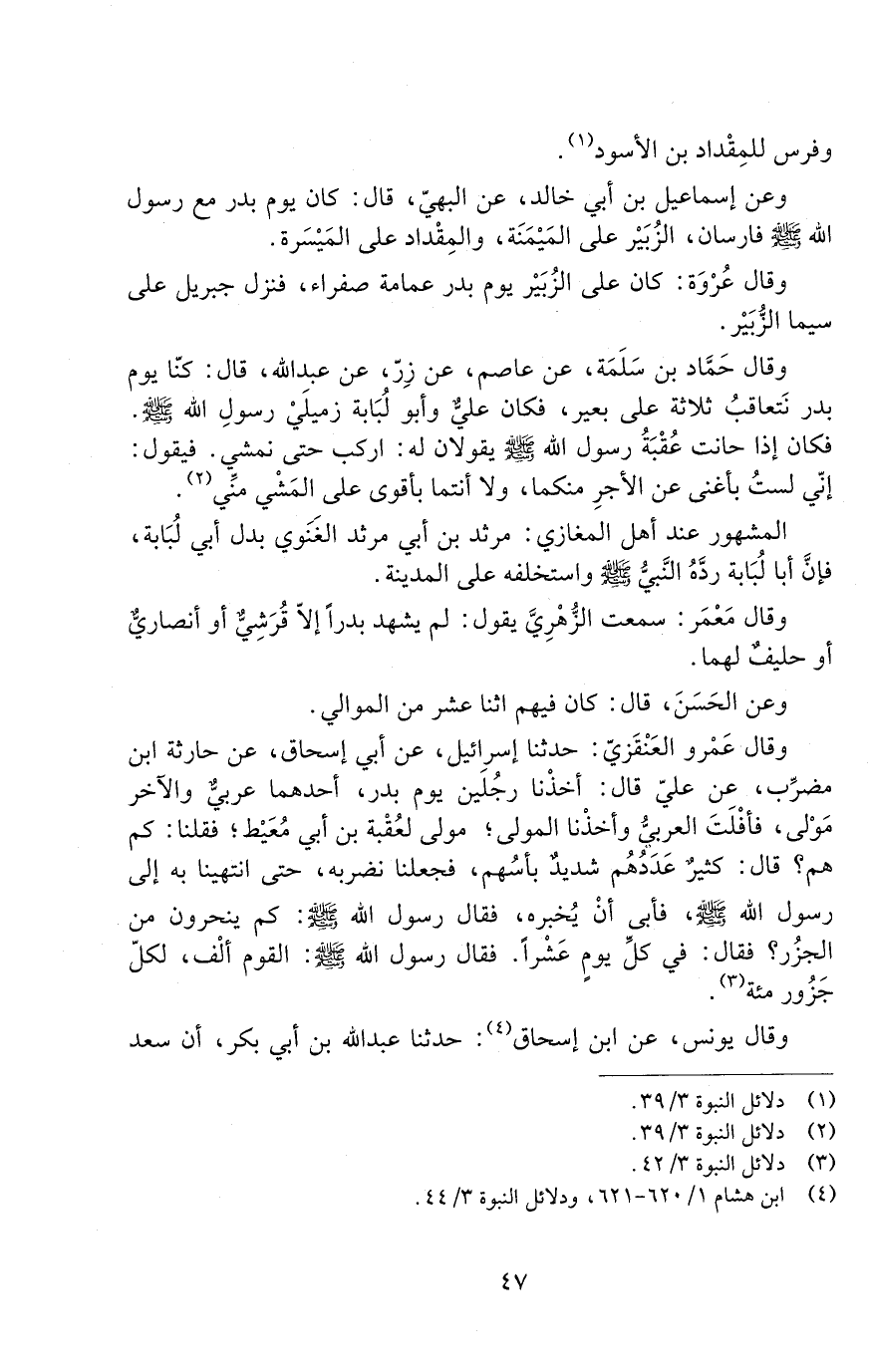وَقَالَ حَمَّادُ بْنُ سَلَمَةَ، عَنْ عَاصِمٍ، عَنْ زِرٍّ، عَنْ عَبْدِ اللَّهِ قَالَ: كُنَّا يَوْمَ بَدْرٍ نَتَعَاقَبُ ثَلَاثَةٌ عَلَى بَعِيرٍ، فَكَانَ عَلِيُّ وَأَبُو لُبَابَةَ زَمِيلَيْ رَسُولِ اللَّهِ - صَلَّى اللَّهُ عَلَيْهِ وَسَلَّمَ -. فَكَانَ إذا حانت عُقْبَةُ رَسُولَ اللَّهِ - صَلَّى اللَّهُ عَلَيْهِ وَسَلَّمَ - يَقُولَانِ لَهُ: ارْكَبْ حَتَّى نَمْشِيَ. فَيَقُولُ: إِنِّي لَسْتُ بِأَغْنَى عَنِ الْأَجْرِ مِنْكُمَا، وَلَا أَنْتُمَا بأقوى عَلَى الْمَشْيِ مِنِّي.