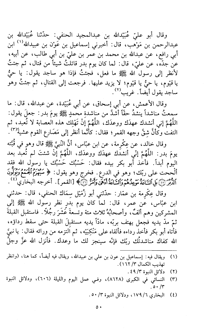 وَقَالَ أَبُو عَلِيٍّ عُبَيْدُ اللَّهِ بْنُ عَبْدِ الْمَجِيدِ الْحَنَفِيُّ: حَدَّثَنَا عُبَيْدُ اللَّهِ بْنُ عَبْدِ الرحمن بن موهب، قال: أخبرني إسماعيل بن عون بْنِ عُبَيْدِ اللَّهِ بْنِ أَبِي رَافِعٍ، عَنْ عَبْدِ اللَّهِ بْنِ مُحَمَّدِ بْنِ عُمَرَ بْنِ عَلِيِّ بْنِ أَبِي طَالِبٍ، عَنْ أَبِيهِ، عَنْ جده، عَنْ عَلِيٍّ قَالَ: لَمَّا كَانَ يَوْمُ بَدْرٍ قَاتَلْتُ شَيْئًا مِنْ قِتَالٍ، ثُمَّ جِئْتُ لِأَنْظُرَ إِلَى رَسُولِ اللَّهِ - صَلَّى اللَّهُ عَلَيْهِ وَسَلَّمَ - مَا فَعَلَ، فَجِئْتُ فَإِذَا هُوَ سَاجِدٌ يَقُولُ: " يَا حَيُّ يَا قَيُّومُ، يَا حَيُّ يَا قَيُّومُ "، لَا يُزِيدُ عَلَيْهَا. فَرَجَعْتُ إِلَى الْقِتَالِ، ثُمَّ جِئْتُ وَهُوَ سَاجِدٌ يَقُولُ أَيْضًا. غَرِيبٌ.