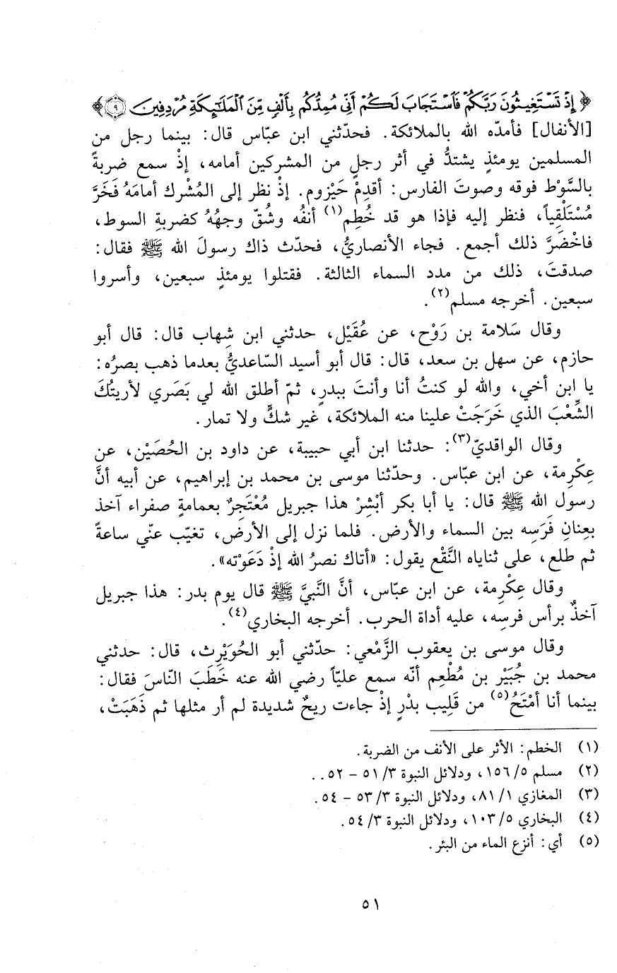 " إِذْ تَسْتَغِيثُونَ رَبَّكُمْ فَاسْتَجَابَ لَكُمْ أَنِّي مُمِدُّكُمْ بِأَلْفٍ مِنَ الْمَلائِكَةِ مُرْدِفِينَ " فَأَمَدَّهُ اللَّهُ بِالْمَلَائِكَةِ. فَحَدَّثَنِي ابْنُ عَبَّاسٍ قَالَ: بَيْنَمَا رَجُلٌ مِنَ الْمُسْلِمِينَ يَوْمَئِذٍ يَشْتَدُّ فِي أَثَرِ رَجُلٍ مِنَ الْمُشْرِكِينَ أَمَامَهُ، إِذْ سَمِعَ ضَرْبَةً بِالسَّوْطِ فَوْقَهُ وصوت الفارس: أقدِمْ حَيْزومَ. إِذْ نَظَرَ إِلَى الْمُشْرِكِ أَمَامَهُ فَخَرَّ مُسْتَلْقِيًا، فَنَظَرَ إِلَيْهِ فَإِذَا هُوَ قَدْ خُطِمَ أَنْفُهُ وَشُقَّ وَجْهُهُ كَضَرْبَةِ السَّوْطِ، فَاخْضَرَّ ذَلِكَ أَجْمَعَ. فَجَاءَ الْأَنْصَارِيُّ، فَحَدَّثَ ذَاكَ رَسُولَ اللَّهِ - صَلَّى اللَّهُ عَلَيْهِ وَسَلَّمَ - فَقَالَ: صَدَقْتَ، ذلك مِنْ مَدَدِ السَّمَاءِ الثَّالِثَةِ فَقَتَلُوا يَوْمَئِذٍ سَبْعِينَ، وَأَسَرُوا سَبْعِينَ. أَخْرَجَهُ مُسْلِمٌ.
