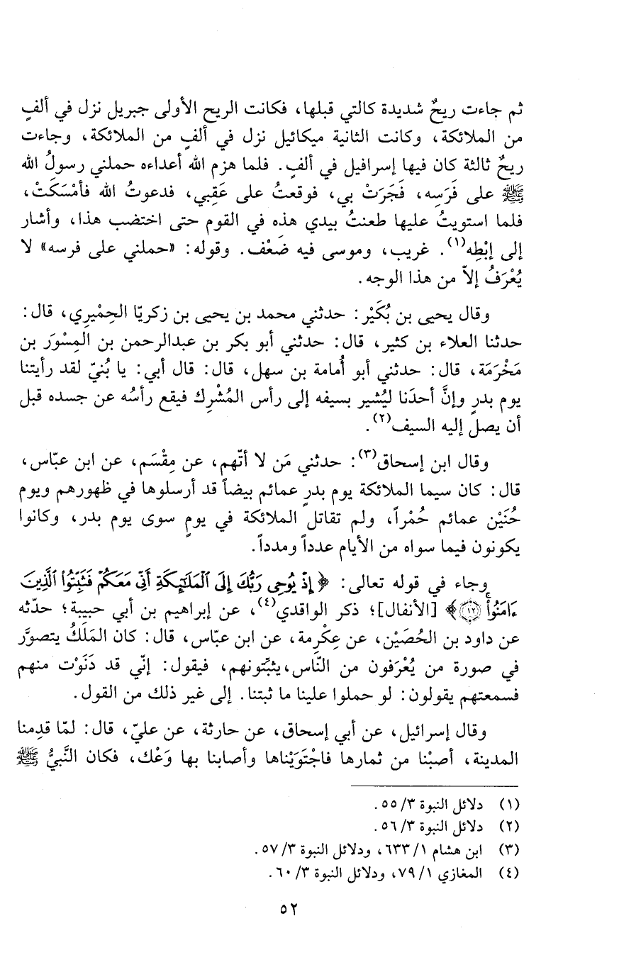 ثُمَّ جَاءَتْ رِيحٌ شَدِيدَةٌ كَالَّتِي قَبْلَهَا. فَكَانَتِ الرِّيحُ الْأُولَى جِبْرِيلَ نَزَلَ فِي أَلْفٍ مِنَ الْمَلَائِكَةِ، وَكَانَتِ الثَّانِيَةُ مِيكَائِيلَ نَزَلَ فِي أَلْفٍ مِنَ الْمَلَائِكَةِ. وَجَاءَتْ رِيحٌ ثَالِثَةٌ كَانَ فِيهَا إسرافيل فِي أَلْفٍ. فَلَمَّا هَزَمَ اللَّهُ أَعْدَاءَهُ حَمَلَنِي رَسُولَ اللَّهِ - صَلَّى اللَّهُ عَلَيْهِ وَسَلَّمَ - عَلَى فَرَسِهِ، فَجَرَتْ بِي، فَوَقَعْتُ عَلَى عَقِبَيَّ، فَدَعَوْتُ اللَّهَ فَأَمْسَكْتُ. فَلَمَّا اسْتَوَيْتُ عَلَيْهَا طَعَنْتُ بِيَدِي هَذِهِ فِي الْقَوْمِ حَتَّى اخْتَضَبَ هَذَا، وَأَشَارَ إِلَى إِبِطِهِ. غَرِيبٌ. وَمُوسَى فِيهِ ضَعْفٌ. وَقَوْلُهُ: " حملني على فرسه " لا يعرف إِلَّا مِنْ هَذَا الْوَجْهِ.