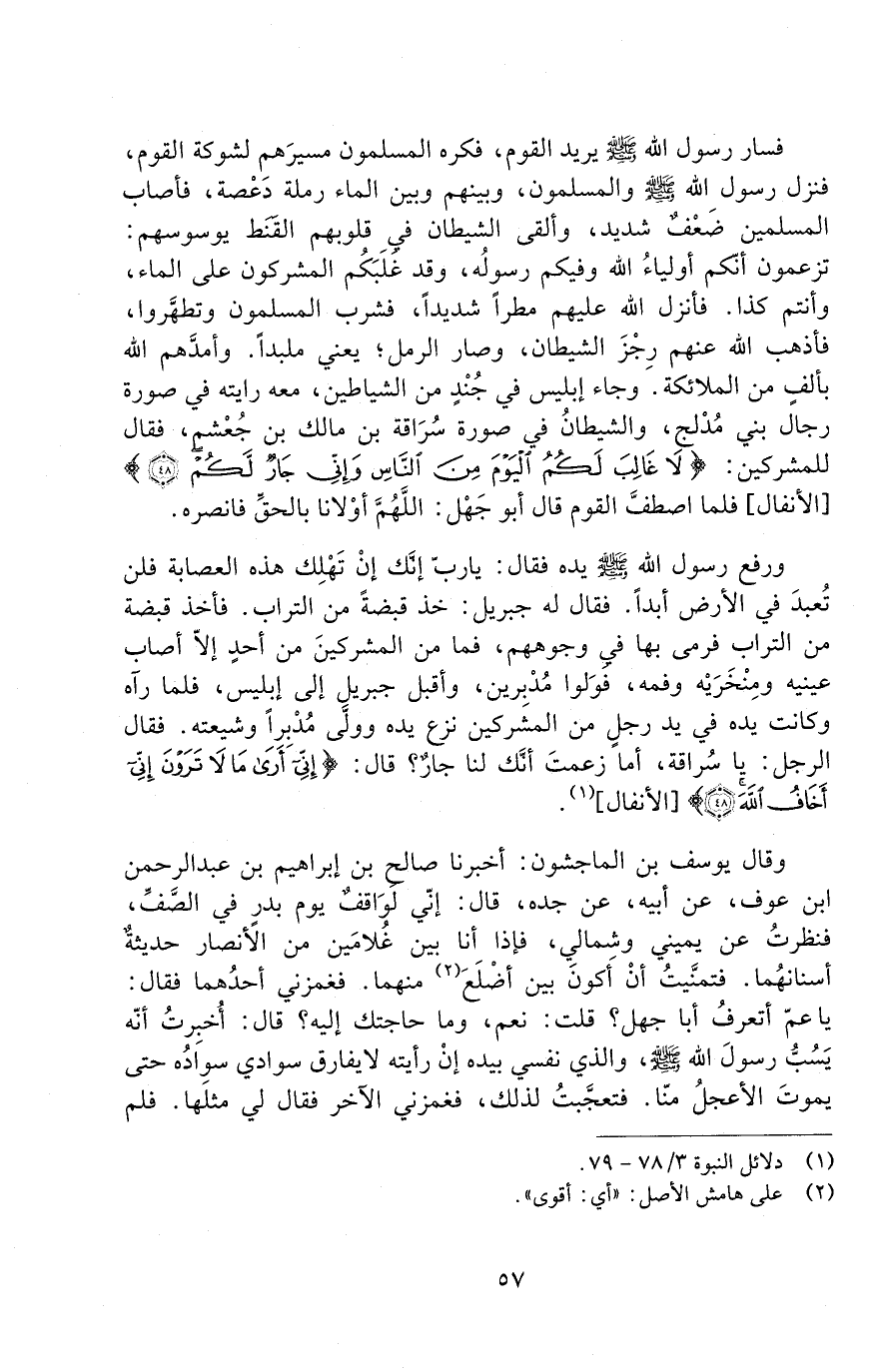 فَسَارَ رَسُولُ اللَّهِ - صَلَّى اللَّهُ عَلَيْهِ وَسَلَّمَ - يُرِيدُ الْقَوْمَ، فَكَرِهَ الْمُسْلِمُونَ مَسِيرَهُمْ لِشَوْكَةِ الْقَوْمِ، فَنَزَلَ رَسُولُ اللَّهِ - صَلَّى اللَّهُ عَلَيْهِ وَسَلَّمَ - وَالْمُسْلِمُونَ، وَبَيْنَهُمْ وَبَيْنَ الْمَاءِ رَمْلَةٌ دِعْصَةٌ، فَأَصَابَ الْمُسْلِمِينَ ضَعْفٌ شَدِيدٌ، وَأَلْقَى الشَّيْطَانُ فِي قُلُوبِهِمُ الْقَنَطَ يُوَسْوِسُهُمْ: تَزْعُمُونَ أَنَّكُمْ أَوْلِيَاءُ اللَّهِ وَفِيكُمْ رَسُولُهُ، وَقَدْ غَلَبَكُمُ الْمُشْرِكُونَ عَلَى الْمَاءِ، وَأَنْتُمْ كَذَا. فَأَنْزَلَ اللَّهُ عَلَيْهِمْ مَطَرًا شَدِيدًا، فَشَرِبَ الْمُسْلِمُونَ وَتَطَهَّرُوا. فَأَذْهَبَ اللَّهُ عَنْهُمْ رِجْزَ الشَّيْطَانِ. وَصَارَ الرَّمْلُ - يَعْنِي مُلَبَّدًا - وَأَمدَّهُمُ اللَّهُ بِأَلْفٍ مِنَ الْمَلَائِكَةِ. وَجَاءَ إِبْلِيسُ فِي جُنْدٍ مِنَ الشياطين، معه رايته في صورة رجال بَنِي مُدْلِجٍ، وَالشَّيْطَانُ فِي صُورَةِ سُرَاقَةَ بْنِ مَالِكِ بْنِ جُعْشُمٍ، فَقَالَ لِلْمُشْرِكِينَ: " لَا غَالِبَ لَكُمُ الْيَوْمَ مِنَ النَّاسِ، وَإنِّي جَارٌ لَكُمْ " فَلَمَّا اصْطَفَّ الْقَوْمُ قَالَ أَبُو جَهْلٍ: اللَّهُمَّ أَوْلَانَا بِالْحَقِّ فَانْصُرْهُ.