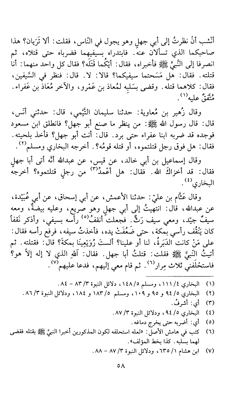 أنْشَبْ أَنْ نَظَرْتُ إِلَى أَبِي جَهْلٍ وَهُوَ يَجُولُ فِي النَّاسِ، فَقُلْتُ: أَلَا تَرَيَانِ؟ هَذَا صَاحِبُكُمَا الَّذِي تَسْأَلَانِ عَنْهُ. فَابْتَدَرَاهُ بِسَيْفَيْهِمَا فَضَرَبَاهُ حَتَّى قَتَلَاهُ. ثُمَّ انْصَرَفَا إِلَى النَّبِيِّ - صَلَّى اللَّهُ عَلَيْهِ وَسَلَّمَ - فَأَخْبَرَاهُ. فَقَالَ: أَيُّكُمَا قَتَلَهُ؟ فَقَالَ كُلُّ وَاحِدٍ مِنْهُمَا: أَنَا قَتَلْتُهُ. فَقَالَ: هَلْ مَسَحْتُمَا سَيْفَيْكُمَا؟ قَالَا: لَا. قَالَ: فَنَظَرَ فِي السَّيْفَيْنِ، فَقَالَ، كِلَاهُمَا قَتَلَهُ. وَقَضَى بِسَلْبِهِ لِمُعَاذِ بْنِ عَمْرٍو، وَالْآخَرِ مُعَاذِ بْنِ عَفْرَاءَ. مُتَّفَقٌ عَلَيْهِ.