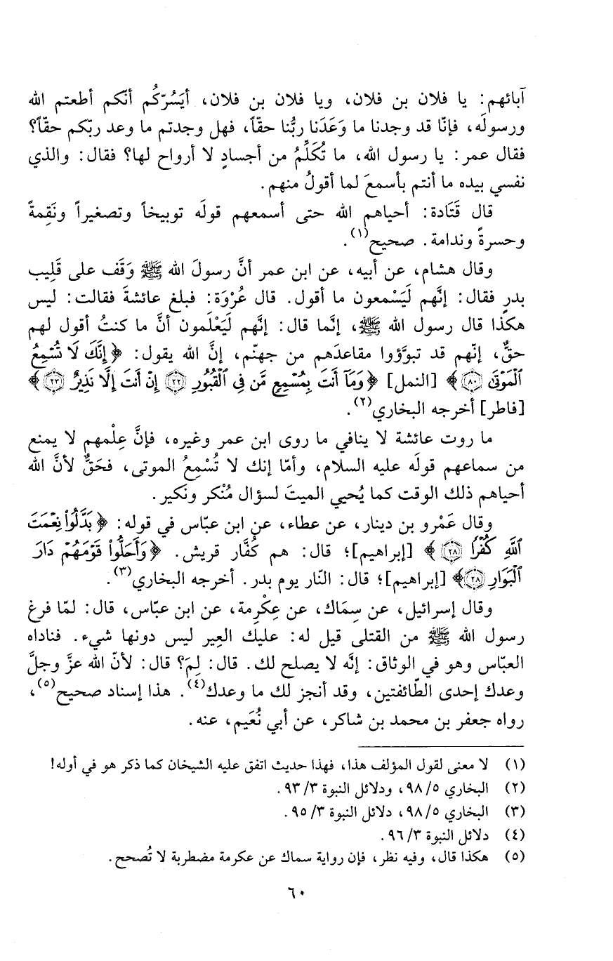 وَقَالَ هِشَامٌ، عَنْ أَبِيهِ، عَنِ ابْنِ عُمَرَ أَنَّ رَسُولَ اللَّهِ - صَلَّى اللَّهُ عَلَيْهِ وَسَلَّمَ - وَقَفَ عَلَى قَلِيبِ بَدْرٍ فَقَالَ: إِنَّهُمْ لَيَسْمَعُونَ مَا أَقُولُ. قَالَ عُرْوَةُ: فَبَلَغَ عَائِشَةَ فَقَالَتْ: لَيْسَ هَكَذَا قَالَ رَسُولُ اللَّهِ - صَلَّى اللَّهُ عَلَيْهِ وَسَلَّمَ -، إِنَّمَا قَالَ: إِنَّهُمْ لَيَعْلَمُونَ أَنَّ مَا كنت أقول لهم حق. إنهم قد تبوؤوا مَقَاعِدَهُمْ مِنْ جَهَنَّمَ. إِنَّ اللَّهَ يَقُولُ: " إِنَّكَ لا تُسْمِعُ الْمَوْتَى " " وَمَا أَنْتَ بِمُسْمِعٍ مَنْ فِي الْقُبُورِ. إِنْ أَنْتَ إِلا نَذِيرٌ " أَخْرَجَهُ الْبُخَارِيُّ.