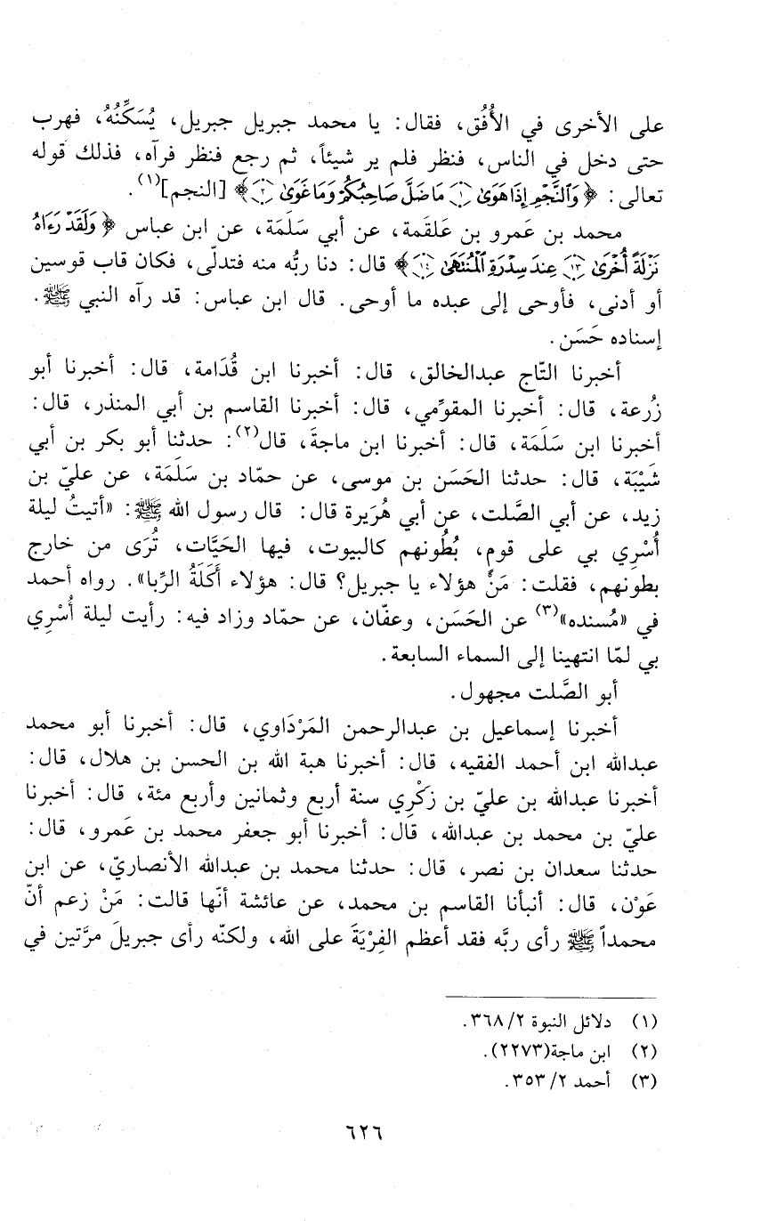 أَخْبَرَنَا إِسْمَاعِيلُ بْنُ عَبْدِ الرَّحْمَنِ الْمَرْدَاوِيُّ، قال: أخبرنا أَبُو مُحَمَّدٍ عَبْدُ اللَّهِ بْنُ أَحْمَدَ الْفَقِيهُ، قال: أخبرنا هبة الله بن الحسن بن هلال، قال: أخبرنا عَبْدُ اللَّهِ بْنُ عَلِيِّ بْنِ زِكْرِي سَنَةَ أربع وثمانين وأربعمائة، قال: أخبرنا عليّ بن محمد بن عبد الله، قال: أخبرنا أبو جعفر محمد بن عمرو، قال: حدثنا سعدان بن نصر، قال: حدثنا مُحَمَّدُ بْنُ عَبْدِ اللَّهِ الْأَنْصَارِيُّ، عَنِ ابْنِ عَوْنٍ قَالَ: أَنْبَأَنَا الْقَاسِمُ بْنُ مُحَمَّدٍ، عَنْ عَائِشَةَ أَنَّهَا قَالَتْ: مَنْ زَعَمَ أَنَّ مُحَمَّدًا صَلَّى اللَّهُ عَلَيْهِ وَسَلَّمَ رَأَى رَبَّهُ فَقَدْ أَعْظَمَ الْفِرْيَةَ عَلَى اللَّهِ، وَلَكِنَّهُ رَأَى جِبْرِيلَ مرّتين في