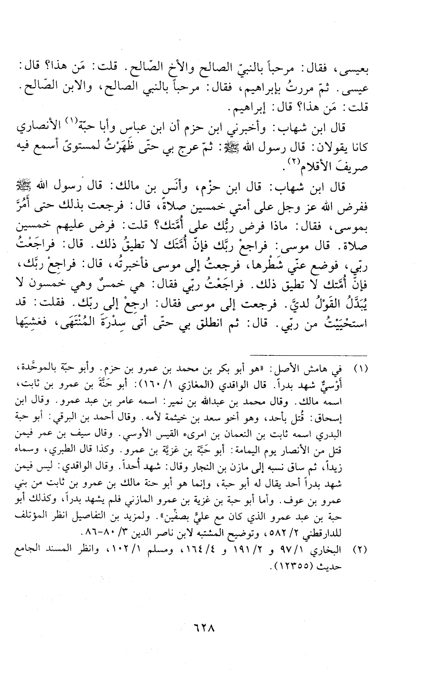 قَالَ ابْنُ شِهَابٍ: وَأَخْبَرَنِي ابْنُ حَزْمٍ أَنَّ ابْنَ عَبَّاسٍ وأبا حبة الأنصاري كانا يقولان: قَالَ رَسُولُ اللَّهِ صَلَّى اللَّهُ عَلَيْهِ وَسَلَّمَ: ثمّ عرج بي حتّى ظهرت لمستوى أَسْمَعُ فِيهِ صَرِيفَ الْأَقْلَامِ.