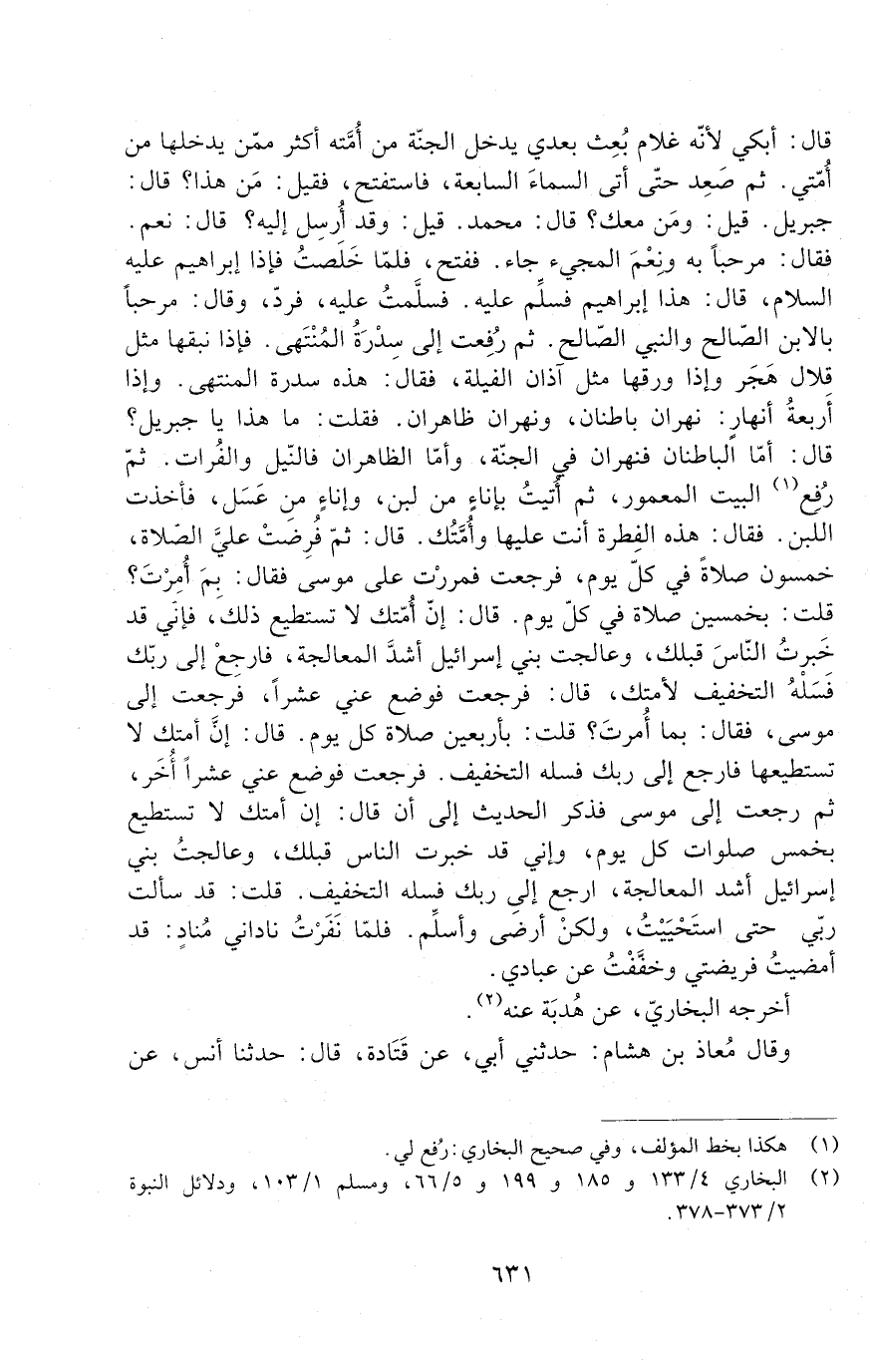 قَالَ: ثُمَّ فُرِضَتْ عَلَيَّ الصَّلَاةُ، خَمْسُونَ صَلَاةً فِي كُلِّ يَوْمٍ، فَرَجَعْتُ فَمَرَرْتُ عَلَى مُوسَى فَقَالَ: بِمَ أُمِرْتَ؟ قُلْتُ: بِخَمْسِينَ صَلَاةً فِي كُلِّ يَوْمٍ. قَالَ: إِنَّ أُمَّتَكَ لَا تَسْتَطِيعُ ذَلِكَ، فَإِنِّي قَدْ خَبَرْتُ النَّاسَ قَبْلَكَ، وَعَالَجْتُ بَنِي إِسْرَائِيلَ أَشَدَّ الْمُعَالَجَةِ، فَارْجِعْ إِلَى رَبِّكَ فَسَلْهُ التخفيف لأمتك، قال: فرجعت فوضع عني عشرا، فرجعت إلى موسى، فقال: بِمَ أمرت؟ قلت: بأربعين صلاة كل يوم. قال: إن أمتك لا تستطيعها فارجع إلى ربك فسله التخفيف. فرجعت فوضع عني عشرا أخر، ثم رجعت إلى موسى، فذكر الحديث إلى أن قال: إن أمتك لا تستطيع بخمس صلوات كل يوم، وإني قَدْ خَبَرْتُ النَّاسَ قَبْلَكَ، وَعَالَجْتُ بَنِي إِسْرَائِيلَ أشد المعالجة، ارجع إِلَى رَبِّكَ فَسَلْهُ التَّخْفِيفَ. قُلْتُ: قَدْ سَأَلْتُ رَبِّي حَتَّى اسْتَحْيَيْتُ، وَلَكِنْ أَرْضَى وَأُسَلِّمُ، فَلَمَّا نَفَرْتُ نَادَانِي مُنَادٍ: قَدْ أَمْضَيْتُ فَرِيضَتِي وَخَفَّفْتُ عَنْ عِبَادِي.