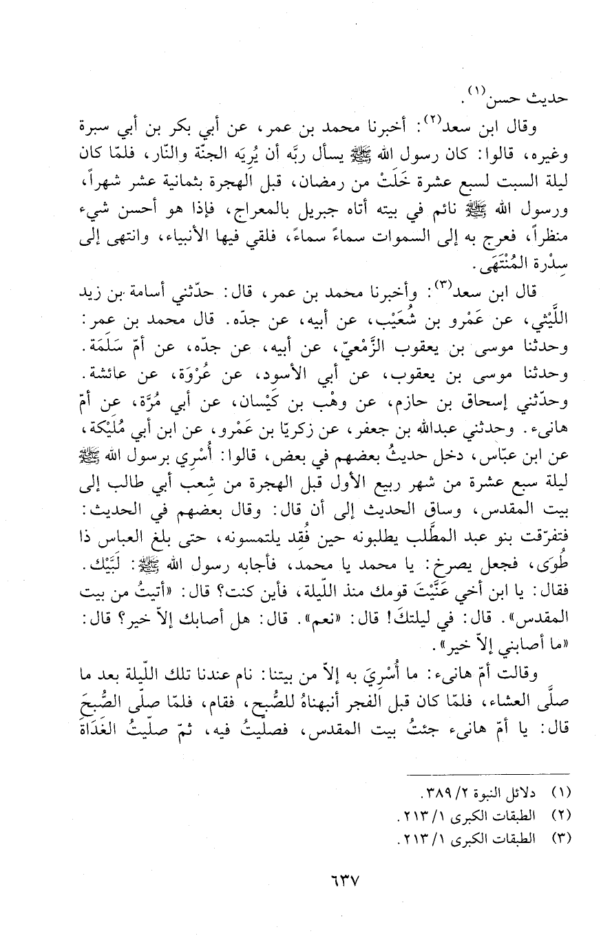 قال ابن سعد: وأخبرنا محمد بن عمر، قال: حَدَّثَنِي أُسَامَةُ بْنُ زَيْدٍ اللَّيْثِيُّ، عَنْ عَمْرِو بْنِ شُعَيْبٍ، عَنْ أَبِيهِ عَنْ جده. قال محمد بن عمر: وحدثنا مُوسَى بْنُ يَعْقُوبَ الزَّمْعِيُّ، عَنْ أَبِيهِ، عَنْ جدّه، عن أمّ سلمة. وحدثنا مُوسَى بْنُ يَعْقُوبَ، عَنْ أَبِي الْأَسْوَدِ، عَنْ عُرْوَةَ، عَنْ عَائِشَةَ. وَحَدَّثَنِي إِسْحَاقُ بْنُ حَازِمٍ، عَنْ وَهْبِ بْنِ كَيْسَانَ، عَنْ أَبِي مُرَّةَ، عَنْ أُمِّ هَانِئٍ، وَحَدَّثَنِي عَبْدُ اللَّهِ بْنُ جَعْفَرٍ، عَنْ زَكَرِيَّا بْنِ عَمْرٍو، عَنِ ابْنِ أَبِي مُلَيْكَةَ، عَنِ ابْنِ عَبَّاسٍ، دَخَلَ حَدِيثُ بَعْضِهِمْ فِي بَعْضٍ قَالُوا: أُسْرِيَ بِرَسُولِ اللَّهِ صَلَّى اللَّهُ عَلَيْهِ وَسَلَّمَ لَيْلَةَ سَبْعَ عَشْرَةَ مِنْ شَهْرِ رَبِيعٍ الْأَوَّلِ قَبْلَ الْهِجْرَةِ مِنْ شِعْبِ أَبِي طَالِبٍ إِلَى بَيْتِ الْمَقْدِسِ، وَسَاقَ الْحَدِيثَ إِلَى أَنْ قَالَ: وَقَالَ بَعْضُهُمْ فِي الْحَدِيثِ: فَتَفَرَّقَتْ بَنُو عَبْدِ الْمُطَّلِبِ يَطْلُبُونَهُ حِينَ فُقِدَ يَلْتَمِسُونَهُ، حَتَّى بَلَغَ الْعَبَّاسُ ذَا طُوَى، فَجَعَلَ يَصْرُخُ: يَا مُحَمَّدُ يَا مُحَمَّدُ، فَأَجَابَهُ رسول الله صلى الله عليه وسلم: لَبَّيْكَ. فَقَالَ: يَا ابْنَ أَخِي عَنَّيْتَ قَوْمَكَ مُنْذُ اللَّيْلَةَ، فَأَيْنَ كُنْتَ؟ قَالَ: أَتَيْتُ مِنْ بَيْتِ الْمَقْدِسِ. قَالَ: فِي لَيْلَتِكَ؟! قَالَ: نَعَمْ. قَالَ: هَلْ أَصَابَكَ إِلَّا خَيْرٌ؟ قَالَ: مَا أَصَابَنِي إِلَّا خَيْرٌ.