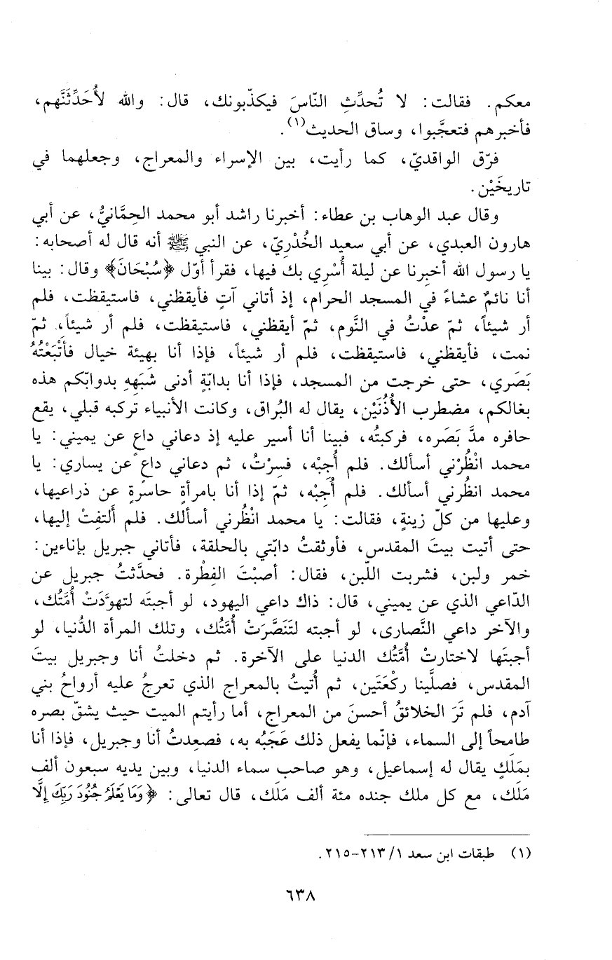 بَيْنَا أَنَا نَائِمٌ عِشَاءً فِي الْمَسْجِدِ الْحَرَامِ، إِذْ أَتَانِي آتٍ فَأَيْقَظَنِي، فَاسْتَيْقَظْتُ، فَلَمْ أَرَ شَيْئًا، ثُمَّ عُدْتُ فِي النَّوْمِ، ثُمَّ أَيْقَظَنِي، فَاسْتَيْقَظْتُ، فَلَمْ أَرَ شَيْئًا، ثُمَّ نِمْتُ، فَأَيْقَظَنِي، فَاسْتَيْقَظْتُ، فَلَمْ أَرَ شَيْئًا، فَإِذَا أَنَا بِهَيْئَةِ خَيَالٍ فَأَتْبَعْتُهُ بَصَرِي، حَتَّى خَرَجْتُ مِنَ الْمَسْجِدِ، فَإِذَا أَنَا بِدَابَّةٍ أَدْنَى شَبَهِهِ بِدَوَابِّكُمْ هَذِهِ بِغَالُكُمْ، مُضْطَرِبَ الْأُذُنَيْنِ، يُقَالَ لَهُ الْبُرَاقُ، وَكَانَتِ الْأَنْبِيَاءُ تَرْكَبُهُ قَبْلِي، يَقَعُ حَافِرُهُ مَدَّ بَصَرِهِ، فَرَكِبْتُهُ، فَبَيْنَا أَنَا أَسِيرُ عَلَيْهِ إِذْ دَعَانِي دَاعٍ عَنْ يَمِينِي: يَا مُحَمَّدُ أَنْظِرْنِي أَسْأَلْكَ، فَلَمْ أُجِبْهُ، فَسِرْتُ، ثُمَّ دَعَانِي دَاعٍ عَنْ يَسَارِي: يَا مُحَمَّدُ أَنْظِرْنِي أَسْأَلْكَ، فَلَمْ أُجِبْهُ، ثُمَّ إِذَا أَنَا بِامْرَأَةٍ حَاسِرَةٍ عَنْ ذِرَاعَيْهَا، وَعَلَيْهَا مِنْ كُلِّ زِينَةٍ، فَقَالَتْ: يَا مُحَمَّدُ أَنْظِرْنِي أَسْأَلْكَ، فَلَمْ أَلْتَفِتْ إِلَيْهَا، حَتَّى أَتَيْتُ بَيْتَ الْمَقْدِسِ، فَأَوْثَقْتُ دَابَّتِي بِالْحَلْقَةِ، فَأَتَانِي جِبْرِيلُ بِإِنَاءَيْنِ: خَمْرٍ وَلَبَنٍ، فَشَرِبْتُ اللَّبَنَ، فَقَالَ: أَصَبْتَ الْفِطْرَةَ، فَحَدَّثْتُ جِبْرِيلَ عَنِ الدَّاعِي الَّذِي عَنْ يَمِينِي، قَالَ: ذَاكَ دَاعِي الْيَهُودِ، لَوْ أَجَبْتَهُ لَتَهَوَّدَتْ أُمَّتُكَ، وَالْآخَرُ دَاعِي النَّصَارَى، لَوْ أَجَبْتَهُ لَتَنَصَّرَتْ أُمَّتُكَ، وَتِلْكَ الْمَرْأَةُ الدُّنْيَا، لَوْ أَجَبْتَهَا لَاخْتَارَتْ أُمَّتُكَ الدُّنْيَا عَلَى الْآخِرَةِ، ثُمَّ دَخَلْتُ أَنَا وَجِبْرِيلُ بَيْتَ الْمَقْدِسِ، فَصَلَّيْنَا رَكْعَتَيْنِ، ثُمَّ أُتِيتُ بِالْمِعْرَاجِ الَّذِي تَعْرُجُ عَلَيْهِ أَرْوَاحُ بَنِي آدَمَ، فَلَمْ تَرَ الْخَلَائِقُ أَحْسَنَ مِنَ الْمِعْرَاجِ، أما رأيتم الميت حيث يُشَقُّ بَصَرُهُ طَامِحًا إِلَى السَّمَاءِ، فَإِنَّمَا يَفْعَلُ ذَلِكَ عَجَبُهُ بِهِ، فَصَعِدْتُ أَنَا وَجِبْرِيلُ، فَإِذَا أَنَا بِمَلَكٍ يُقَالُ لَهُ إِسْمَاعِيلُ، وَهُوَ صَاحِبُ سَمَاءِ الدُّنْيَا، وَبَيْنَ يَدَيْهِ سَبْعُونَ أَلْفَ مَلَكٍ مع كل ملك جنده مائة أَلْفَ مَلَكٍ، قَالَ تَعَالَى {وَمَا يَعْلَمُ جُنُودَ رَبِّكَ إِلا هُوَ}.