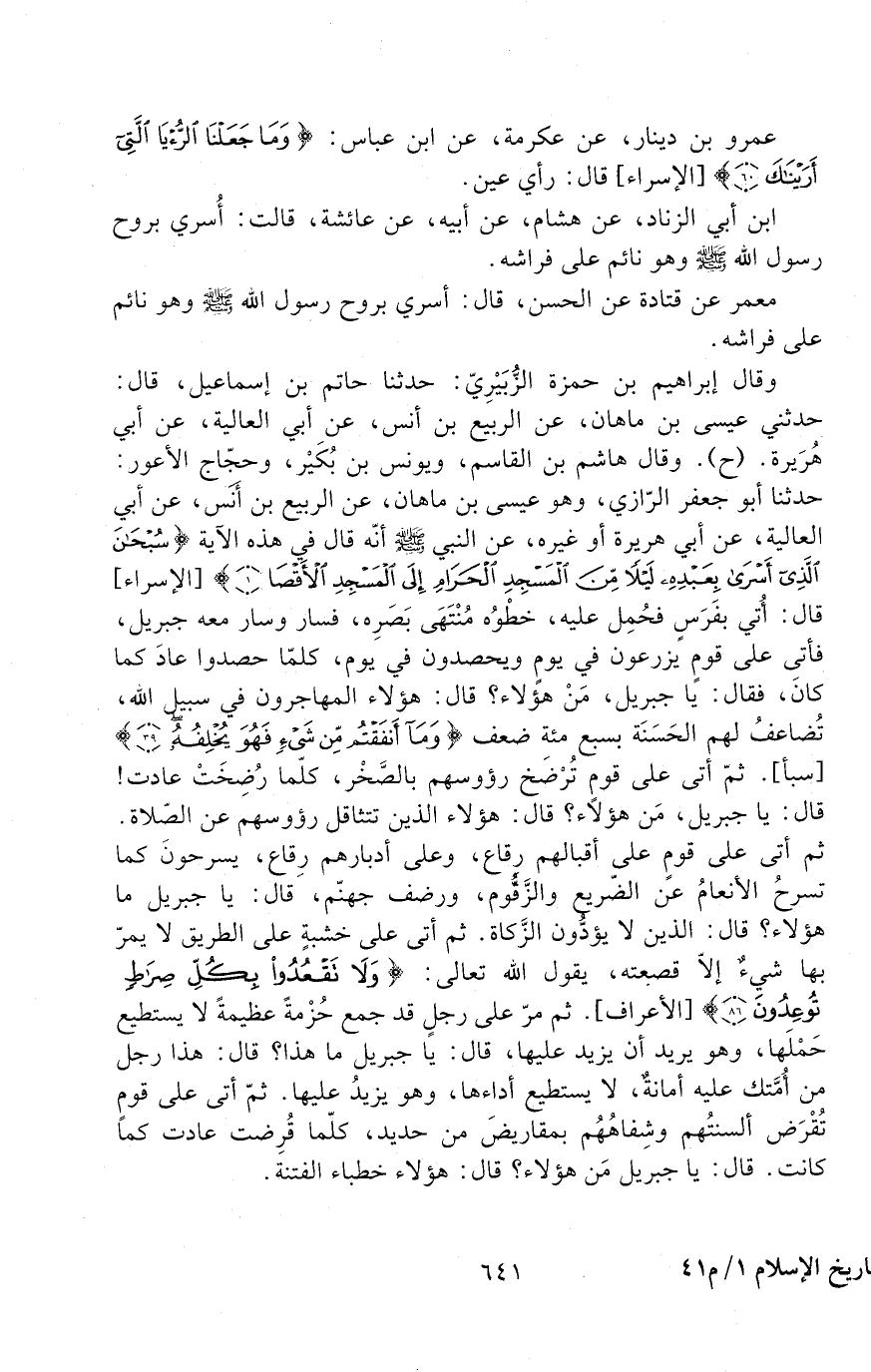 وَقَالَ إِبْرَاهِيمُ بن حمزة الزّبيريّ: حدثنا حاتم بن إسماعيل، قال: حَدَّثَنِي عِيسَى بْنُ مَاهَانَ، عَنِ الرَّبِيعِ بْنِ أَنَسٍ، عَنْ أَبِي الْعَالِيَةِ، عَنْ أَبِي هُرَيْرَةَ. (ح) وَقَالَ هَاشِمُ بْنُ الْقَاسِمِ، وَيُونُسُ بْنُ بكير، وحجّاج الأعور، حدثنا أَبُو جَعْفَرٍ الرَّازِيُّ، وَهُوَ عِيسَى بْنُ مَاهَانَ، عَنِ الرَّبِيعِ بْنِ أَنَسٍ، عَنْ أَبِي الْعَالِيَةِ، عَنْ أَبِي هُرَيْرَةَ أَوْ غَيْرِهِ، عَنِ النَّبِيِّ صَلَّى اللَّهُ عَلَيْهِ وَسَلَّمَ أَنَّهُ قَالَ فِي هَذِهِ الْآيَةِ {سُبْحَانَ الَّذِي أَسْرَى بِعَبْدِهِ لَيْلا من المسجد الحرام إلى المسجد الأقصا} قَالَ: أُتِيَ بِفَرَسٍ فَحُمِلَ عَلَيْهِ، خَطْوُهُ مُنْتَهَى بَصَرِهِ، فَسَارَ وَسَارَ مَعَهُ جِبْرِيلُ، فَأَتَى عَلَى قَوْمٍ يَزْرَعُونَ فِي يَوْمٍ وَيَحْصُدُونَ فِي يَوْمٍ، كُلَّمَا حَصَدُوا عَادَ كَمَا كَانَ، فَقَالَ: يَا جِبْرِيلُ، مَنْ هَؤُلَاءِ؟ قَالَ: هَؤُلَاءِ الْمُهَاجِرُونَ فِي سَبِيلِ اللَّهِ، تُضَاعَفُ لَهُمُ الْحَسَنَةُ بِسُبْعُمِائَةِ ضِعْفٍ {وَمَا أَنْفَقْتُمْ مِنْ شَيْءٍ فَهُوَ يُخْلِفُهُ}. ثُمَّ أتى على قوم ترضخ رؤوسهم بِالصَّخْرِ، كُلَّمَا رُضِخَتْ عَادَتْ! قَالَ: يَا جِبْرِيلُ، من هؤلاء؟ قال: هؤلاء الذين تتثاقل رؤوسهم عَنِ الصَّلَاةِ، ثُمَّ أَتَى عَلَى قَوْمٍ عَلَى أَقْبَالِهِمْ رِقَاعٌ، وَعَلَى أَدْبَارِهِمْ رِقَاعٌ، يَسْرَحُونَ كَمَا تَسْرَحُ الْأَنْعَامُ عَنِ الضَّرِيعِ وَالزَّقُّومِ، وَرَضْفِ جَهَنَّمَ، قَالَ: يَا جِبْرِيلُ مَا هَؤُلَاءِ؟ قَالَ: الَّذِينَ لَا يُؤَدُّونَ الزَّكَاةَ، ثُمَّ أَتَى عَلَى خَشَبَةٍ عَلَى الطَّرِيقِ، لَا يَمُرُّ بِهَا شَيْءٌ إِلَّا قَصَعَتْهُ، يَقُولُ اللَّهُ تَعَالَى: {وَلا تَقْعُدُوا بِكُلِّ صِرَاطٍ تُوعِدُونَ}. ثُمَّ مَرَّ عَلَى رَجُلٍ قَدْ جَمَعَ حِزْمَةً عَظِيمَةً لَا يَسْتَطِيعُ حَمْلَهَا، وَهُوَ يُرِيدُ أَنْ يَزِيدَ عَلَيْهَا، قَالَ: يَا جِبْرِيلُ مَا هَذَا؟ قَالَ: هَذَا رَجُلٌ مِنْ أُمَّتِكَ عَلَيْهِ أَمَانَةٌ، لَا يَسْتَطِيعُ أَدَاءَهَا، وَهُوَ يَزِيدُ عَلَيْهَا، ثُمَّ أَتَى عَلَى قَوْمٍ تُقْرَضُ أَلْسِنَتُهُمْ وَشِفَاهُهُمْ بِمَقَارِيضَ مِنْ حَدِيدٍ، كُلَّمَا قُرِضَتْ عَادَتْ كَمَا كَانَتْ. قَالَ: يَا جِبْرِيلُ مَنْ هَؤُلَاءِ؟ قَالَ: هَؤُلَاءِ خُطَبَاءُ الْفِتْنَةِ.