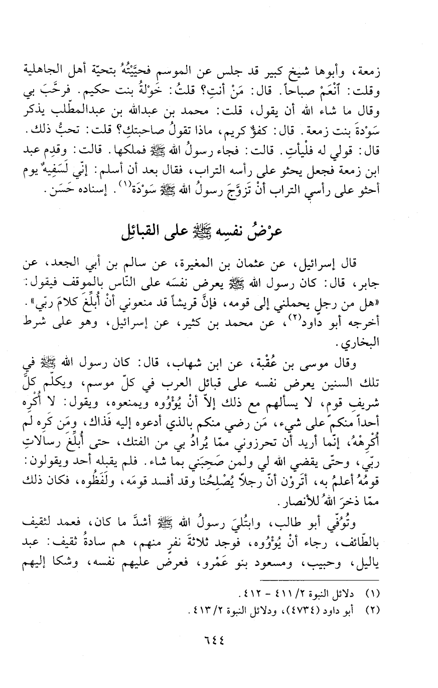 زَمْعَةَ، وَأَبُوهَا شَيْخٌ كَبِيرٌ قَدْ جَلَسَ عَنِ الْمَوْسِمِ فَحَيَّيْتُهُ بِتَحِيَّةِ أَهْلِ الْجَاهِلِيَّةِ وَقُلْتُ: أَنْعِمْ صَبَاحًا، قَالَ: مَنْ أَنْتِ؟ قُلْتُ: خَوْلَةُ بِنْتُ حَكِيمٍ، فَرَحَّبَ بِي وَقَالَ مَا شَاءَ اللَّهُ أَنْ يَقُولَ، قُلْتُ: مُحَمَّدُ بْنُ عَبْدِ اللَّهِ بْنِ عَبْدِ الْمُطَّلِبِ يَذْكُرُ سَوْدَةَ بِنْتَ زَمْعَةَ، قَالَ: كُفْؤٌ كَرِيمٌ، مَاذَا تَقُولُ صَاحِبَتُكِ؟ قُلْتُ: تُحِبُّ ذَلِكَ، قَالَ: قُولِي لَهُ فَلْيَأْتِ، قَالَتْ: فَجَاءَ رَسُولُ اللَّهِ صَلَّى اللَّهُ عَلَيْهِ وَسَلَّمَ فَمَلَكَهَا. قَالَتْ: وَقَدِمَ عَبْدُ بْنُ زَمْعَةَ فَجَعَلَ يَحْثُو عَلَى رَأْسِهِ التُّرَابَ، فَقَالَ بَعْدَ أَنْ أَسْلَمَ: إِنِّي لَسَفِيهٌ يَوْمَ أَحْثُو عَلَى رَأْسِي التُّرَابَ أَنْ تَزَوَّجَ رَسُولُ اللَّهِ صَلَّى اللَّهُ عَلَيْهِ وَسَلَّمَ سَوْدَةَ. إِسْنَادُهُ حَسَنٌ.