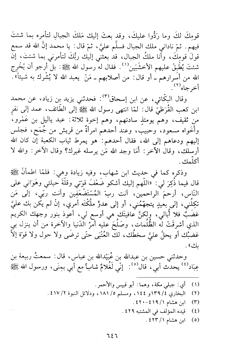 وَذَكَرَهُ كَمَا فِي حَدِيثِ ابْنِ شِهَابٍ، وَفِيهِ زِيَادَةٌ وَهِيَ: فَلَمَّا اطْمَأَنَّ صَلَّى اللَّهُ عَلَيْهِ وَسَلَّمَ قَالَ فِيمَا ذُكِرَ لِي: " اللَّهُمُّ إِلَيْكَ أَشْكُو ضَعْفَ قُوَّتِي وَقِلَّةَ حِيلَتِي وَهَوَانِي عَلَى النَّاسِ، أَرْحَمَ الرَّاحِمِينَ، أَنْتَ رَبُّ الْمُسْتَضْعَفِينَ وَأَنْتَ رَبِّي، إِلَى مَنْ تَكِلُنِي، إِلَى بَعِيدٍ يَتَجَهَّمُنِي، أَوْ إِلَى عَدُوٍّ مَلَّكْتَهُ أَمْرِي، إِنْ لَمْ يَكُنْ بِكَ عَلَيَّ غَضَبٌ فَلَا أُبَالِي، وَلَكِنَّ عَافِيَتَكَ هِيَ أَوْسَعُ لِي، أَعُوذُ بِنُورِ وَجْهِكَ الْكَرِيمِ الَّذِي أَشْرَقَتْ لَهُ الظُّلُمَاتُ، وَصَلَحَ عَلَيْهِ أَمْرُ الدُّنْيَا وَالْآخِرَةِ مِنْ أَنْ يَنْزِلَ بِي غَضَبُكَ أَوْ يَحِلَّ عليّ سخط، لَكَ الْعُتْبَى حَتَّى تَرْضَى وَلَا حَوْلَ وَلَا قُوَّةَ إِلَّا بِكَ ".