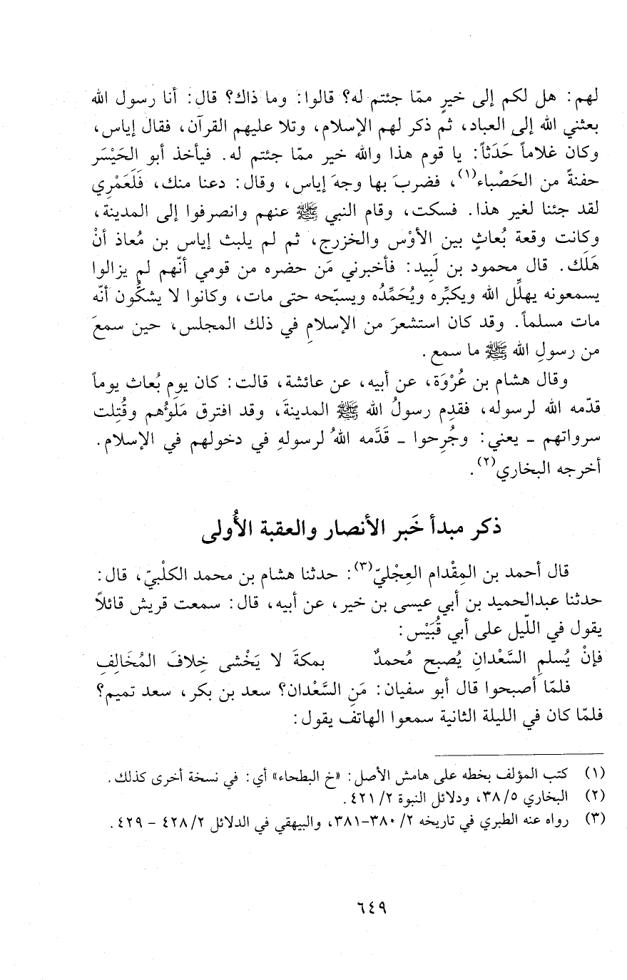 لَهُمْ: هَلْ لَكُمْ إِلَى خَيْرٍ مِمَّا جِئْتُمْ لَهُ؟ قَالُوا: وَمَا ذَاكَ؟ قَالَ: أَنَا رَسُولُ اللَّهِ بَعَثَنِي اللَّهُ إِلَى الْعِبَادِ، ثُمَّ ذَكَرَ لَهُمُ الْإِسْلَامَ، وَتَلَا عَلَيْهِمُ الْقُرْآنَ، فَقَالَ إِيَاسٌ، وَكَانَ غُلَامًا حَدَثًا: يَا قَوْمُ هَذَا وَاللَّهِ خَيْرٌ مِمَّا جِئْتُمْ لَهُ، فَيَأْخُذُ أَبُو الْحَيْسَرِ حفنة من الحصباء، فضرب بِهَا وَجْهَ إِيَاسٍ، وَقَالَ: دَعْنَا مِنْكَ، فَلَعَمْرِي لَقَدْ جِئْنَا لِغَيْرِ هَذَا، فَسَكَتَ، وَقَامَ النَّبِيُّ صَلَّى اللَّهُ عَلَيْهِ وَسَلَّمَ عَنْهُمْ وَانْصَرَفُوا إِلَى الْمَدِينَةِ، وَكَانَتْ وَقْعَةُ بُعَاثٍ بَيْنَ الْأَوْسِ وَالْخَزْرَجِ، ثُمَّ لَمْ يَلْبَثْ إِيَاسُ بْنُ مُعَاذٍ أَنْ هَلَكَ. قَالَ مَحْمُودُ بْنُ لَبِيدٍ: فَأَخْبَرَنِي مَنْ حَضَرَهُ مِنْ قَوْمِي أَنَّهُمْ لَمْ يَزَالُوا يَسْمَعُونَهُ يُهَلِّلُ اللَّهَ وَيُكَبِّرُهُ وَيَحْمَدُهُ وَيُسَبِّحُهُ حَتَّى مَاتَ، وَكَانُوا لَا يَشُكُّونَ أَنَّهُ مَاتَ مُسْلِمًا. وَقَدْ كَانَ اسْتُشْعِرَ مِنْهُ الْإِسْلَامُ فِي ذَلِكَ الْمَجْلِسِ، حِينَ سَمِعَ مِنْ رَسُولِ اللَّهِ صَلَّى اللَّهُ عَلَيْهِ وَسَلَّمَ مَا سَمِعَ.